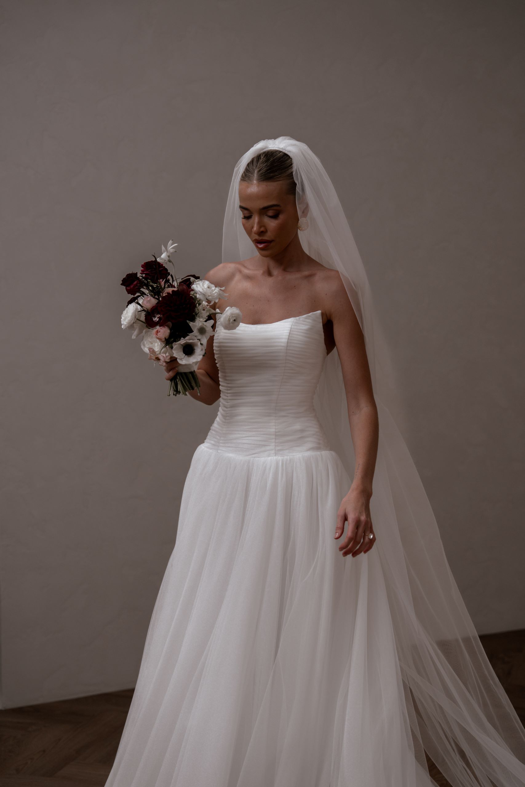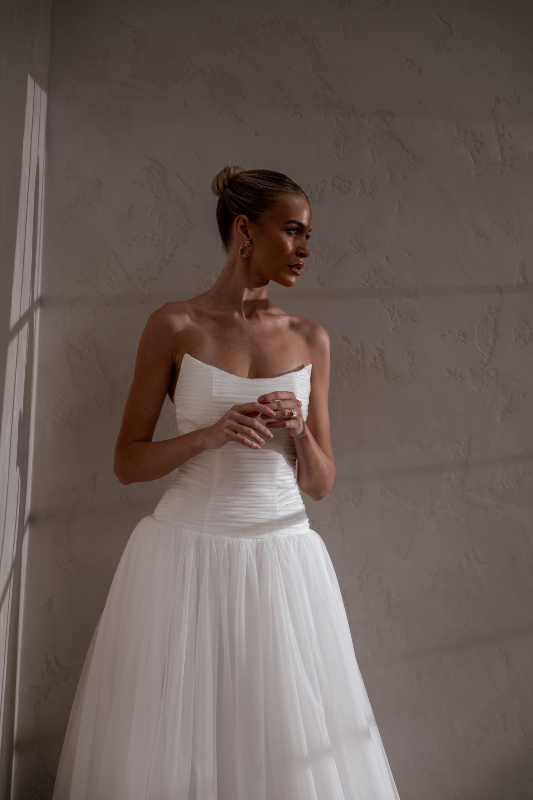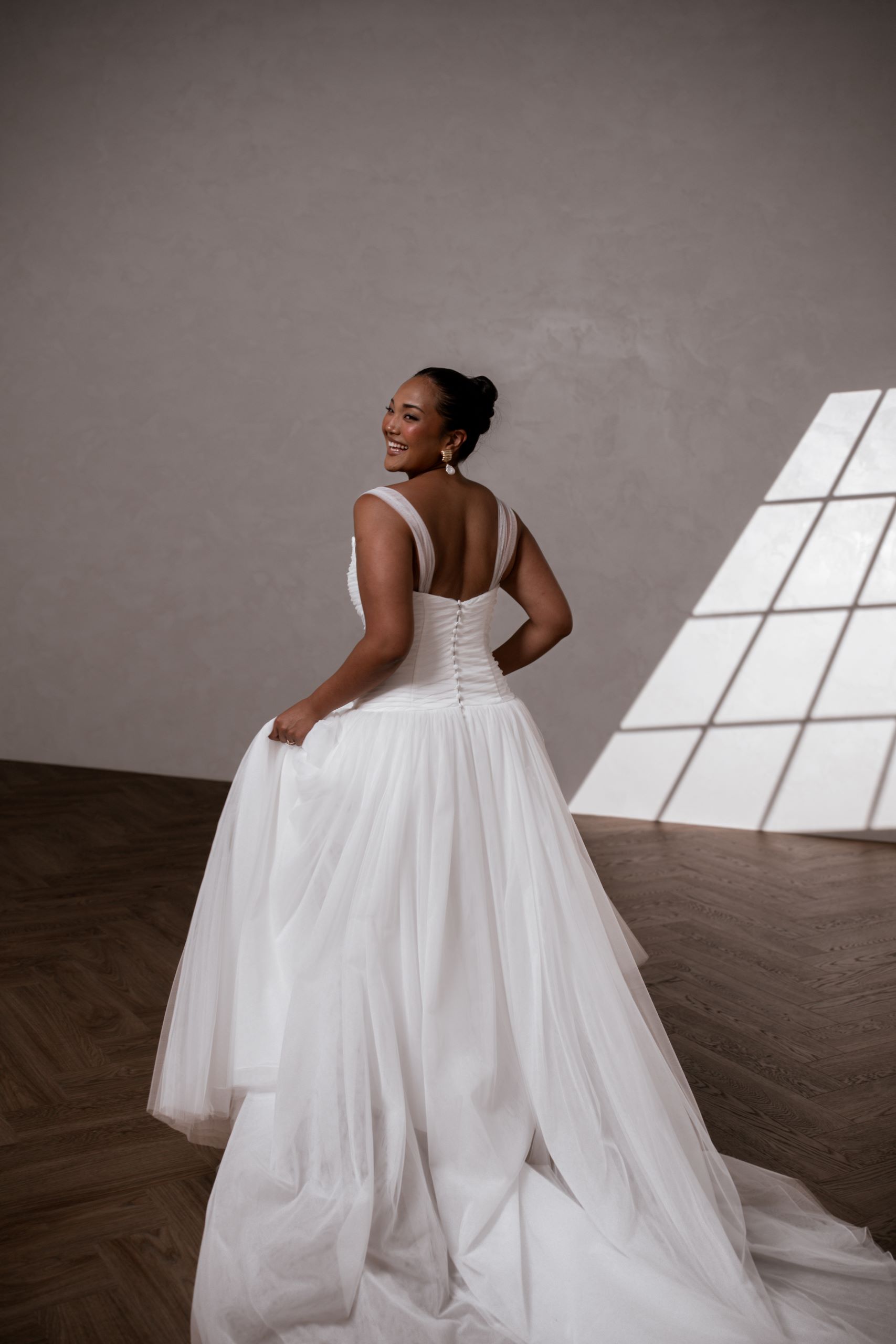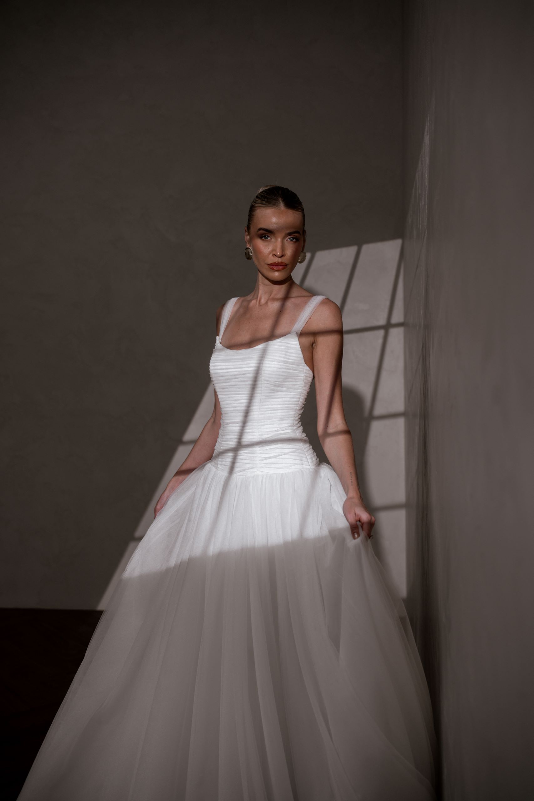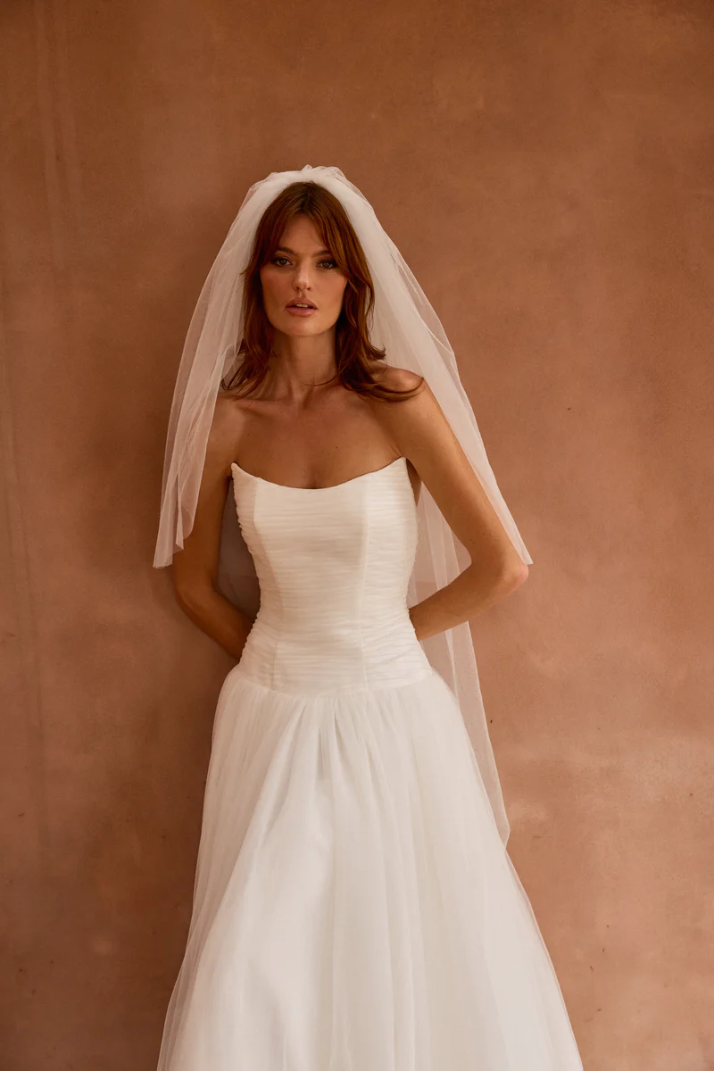 Our enchanting Aire features a peaked pleated tulle bodice that beautifully hugs the silhouette, creating an elegant and structured look. Her sophisticated drop waist adds a touch of modern flair, elongating the figure and gracefully transitioning to a soft, flowing A-line skirt.