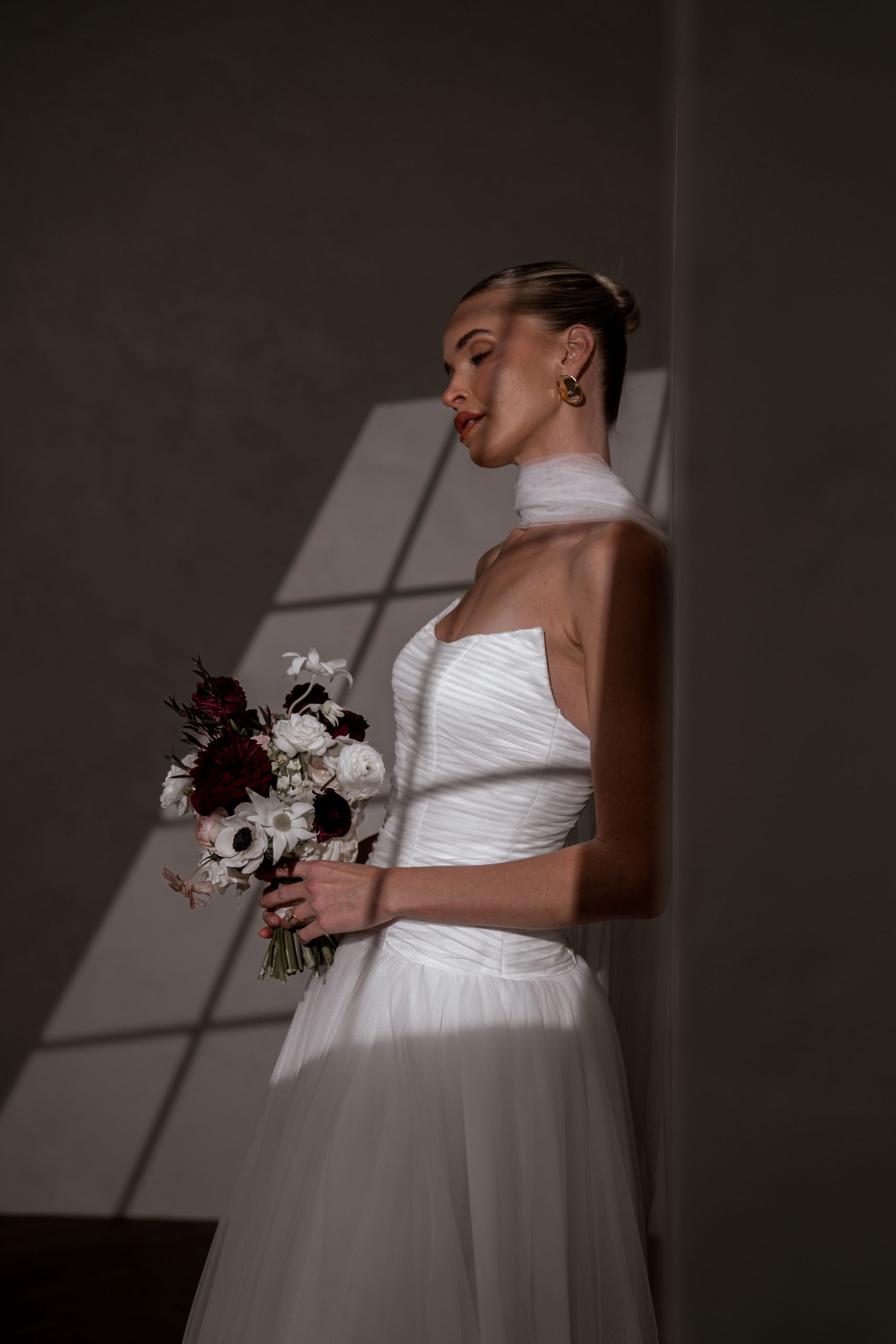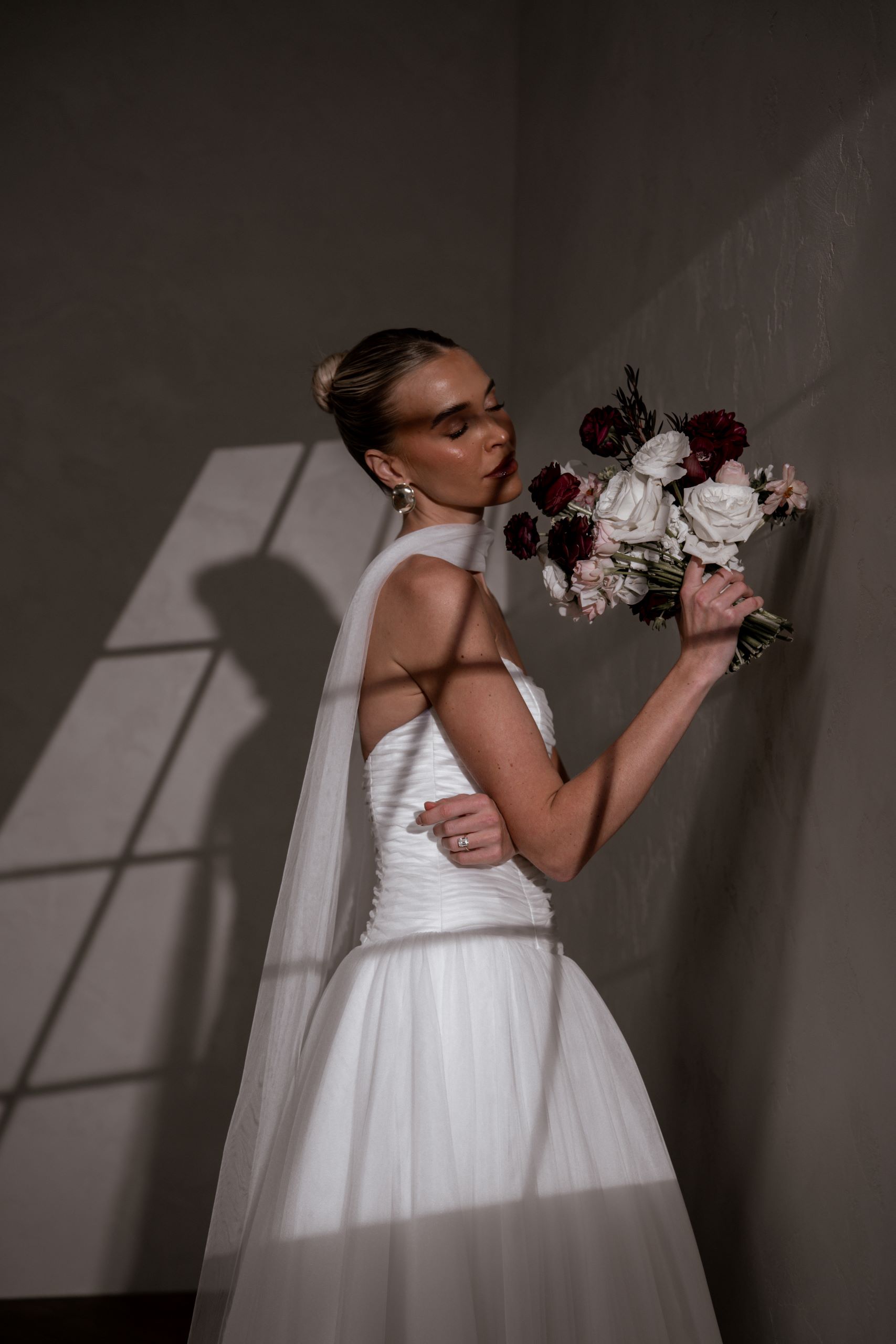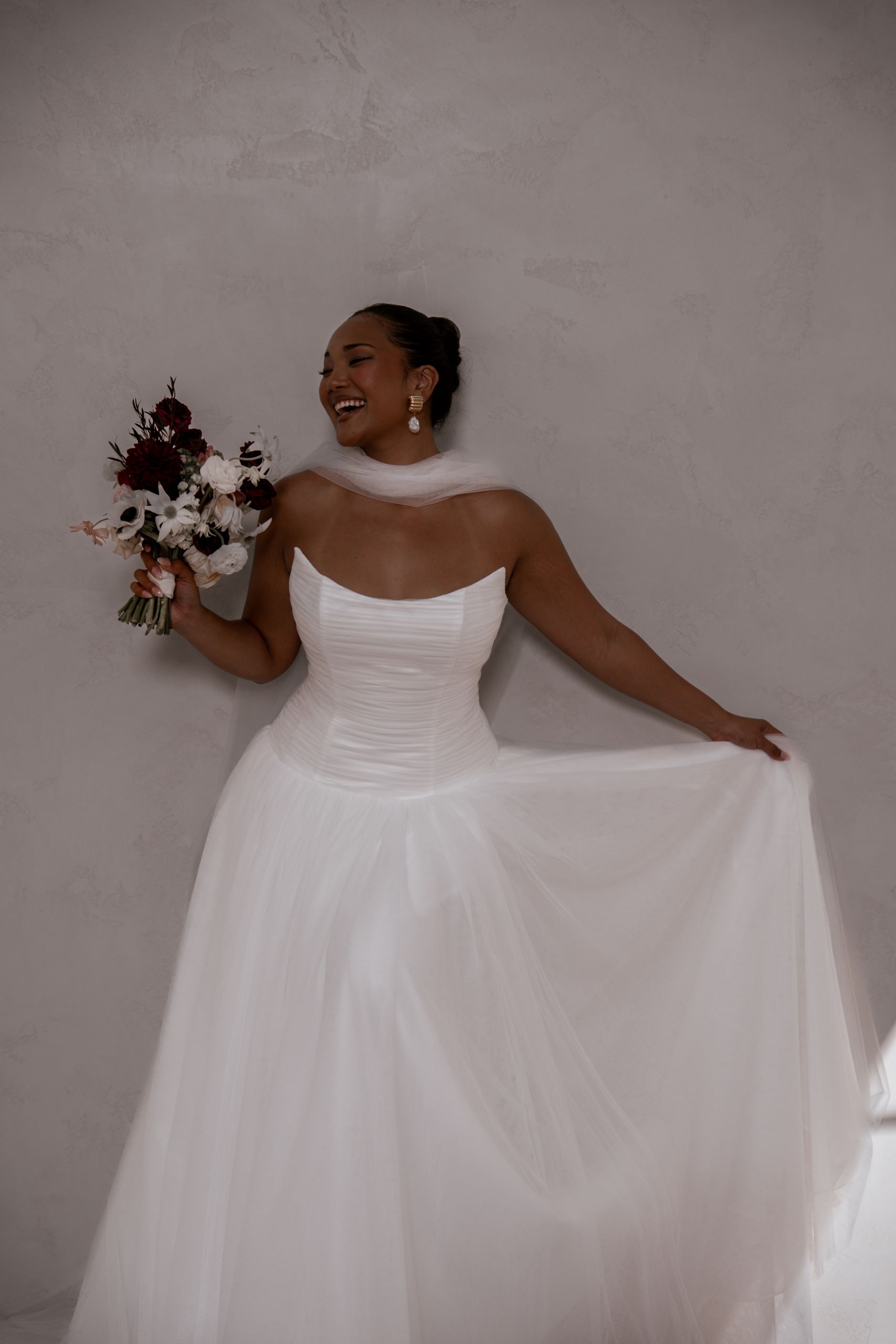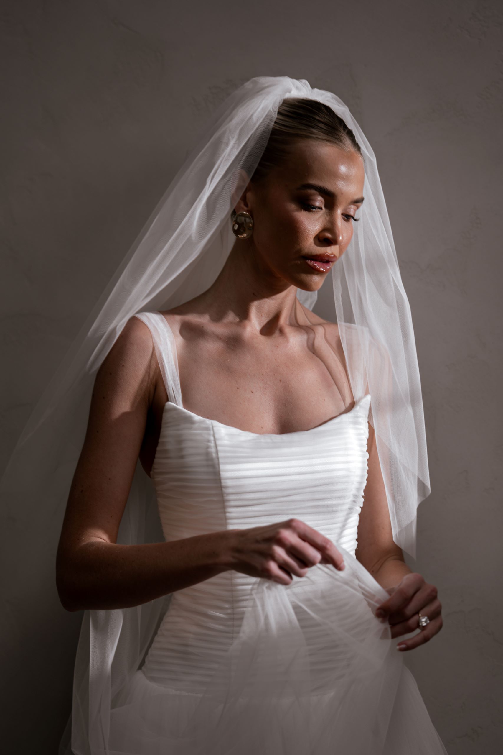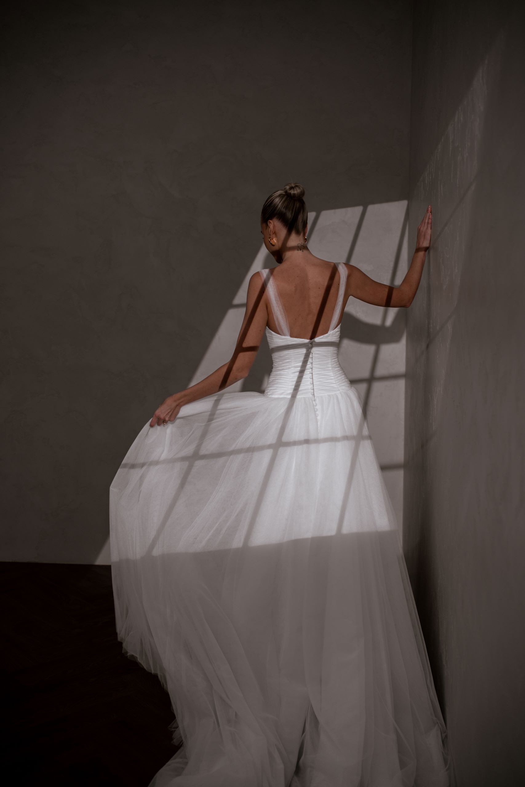 Our enchanting Aire features a peaked pleated tulle bodice that beautifully hugs the silhouette, creating an elegant and structured look. Her sophisticated drop waist adds a touch of modern flair, elongating the figure and gracefully transitioning to a soft, flowing A-line skirt.