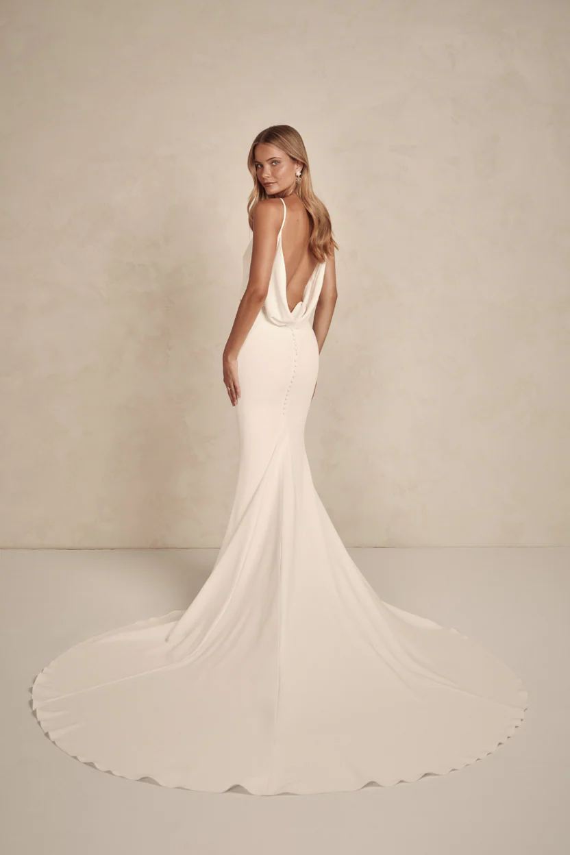 MWL is renowned for our iconic cowls, and Alfie’s perfected design enchants. Her double, crossed-cowl back weaves a delicate, intricate twist on a beloved detail, creating a look that’s effortlessly captivating.