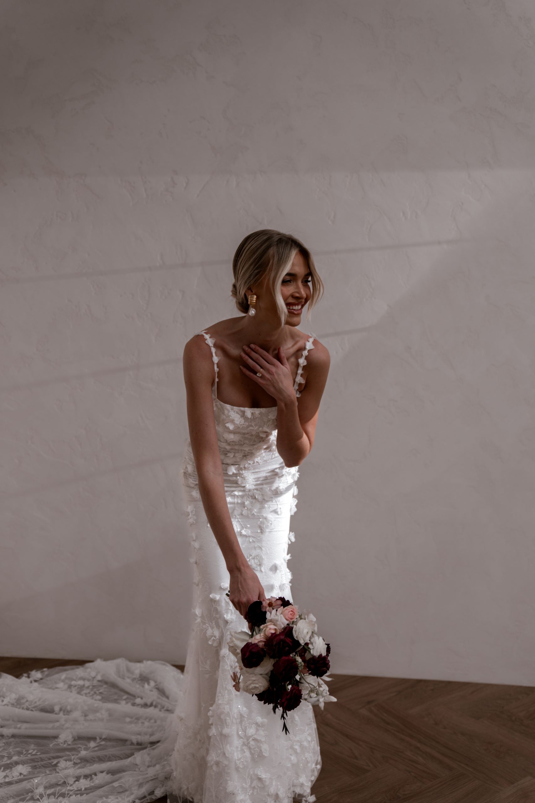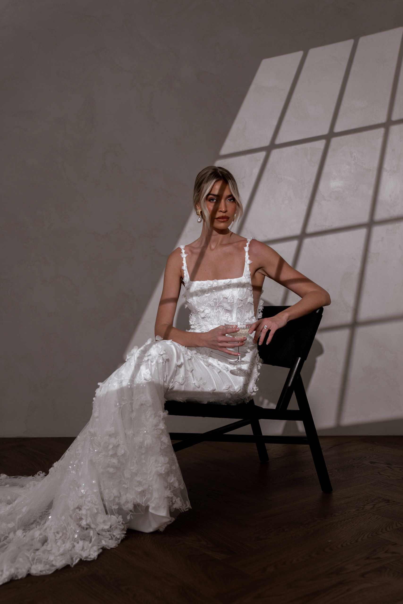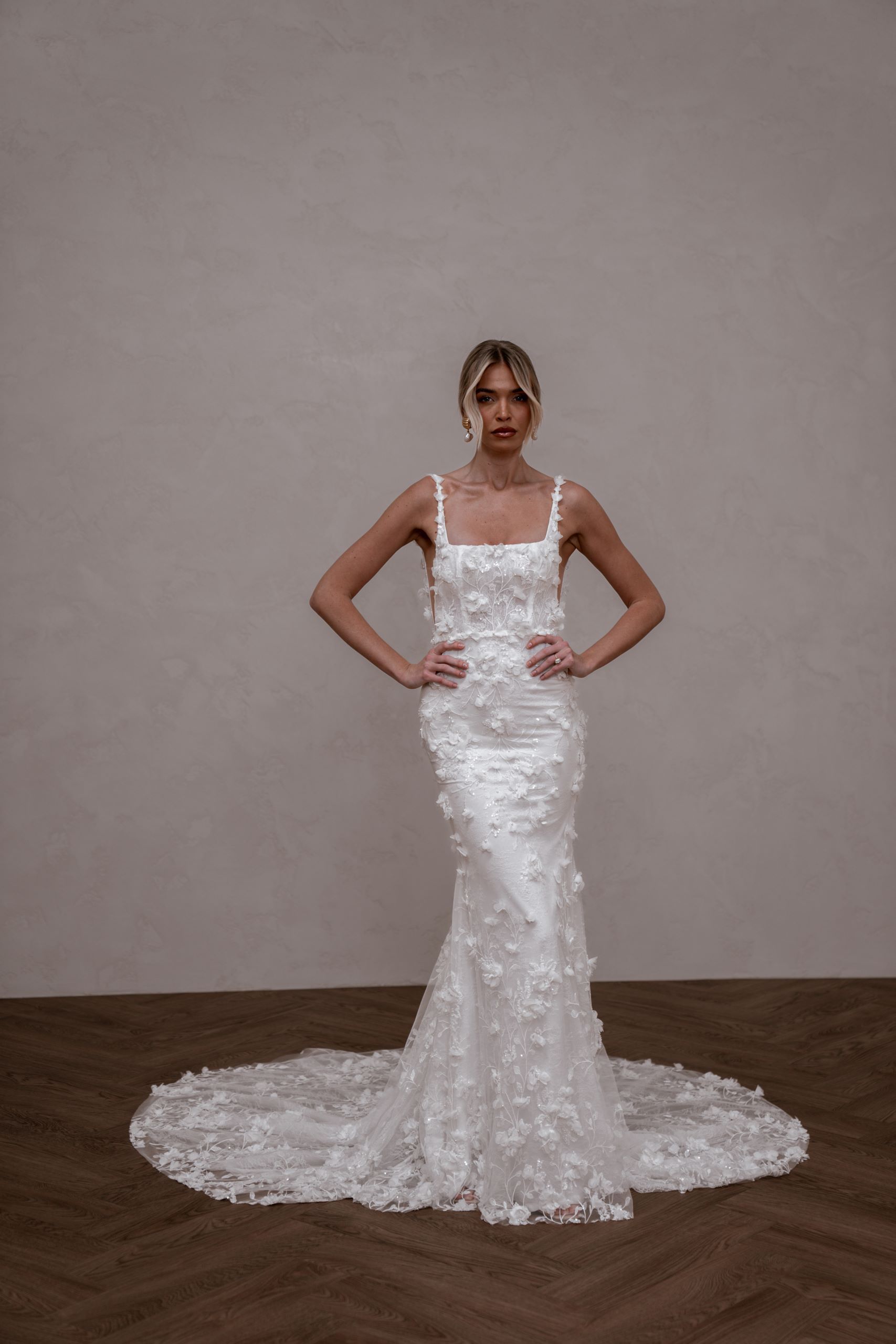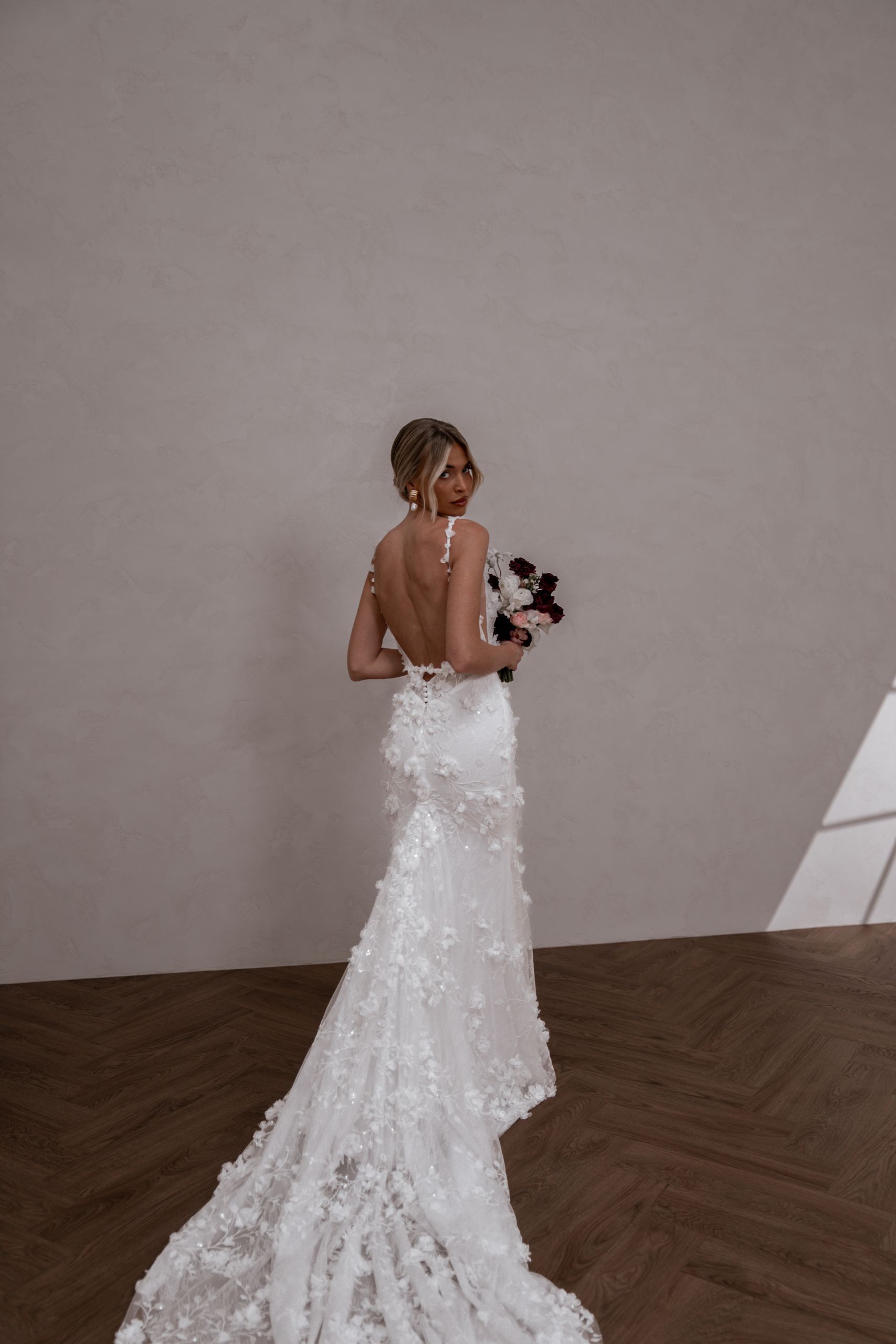 Crafted from our never-before-seen exquisite 3D embroidered petal lace, Atlas brings a touch of nature’s beauty to your special day.