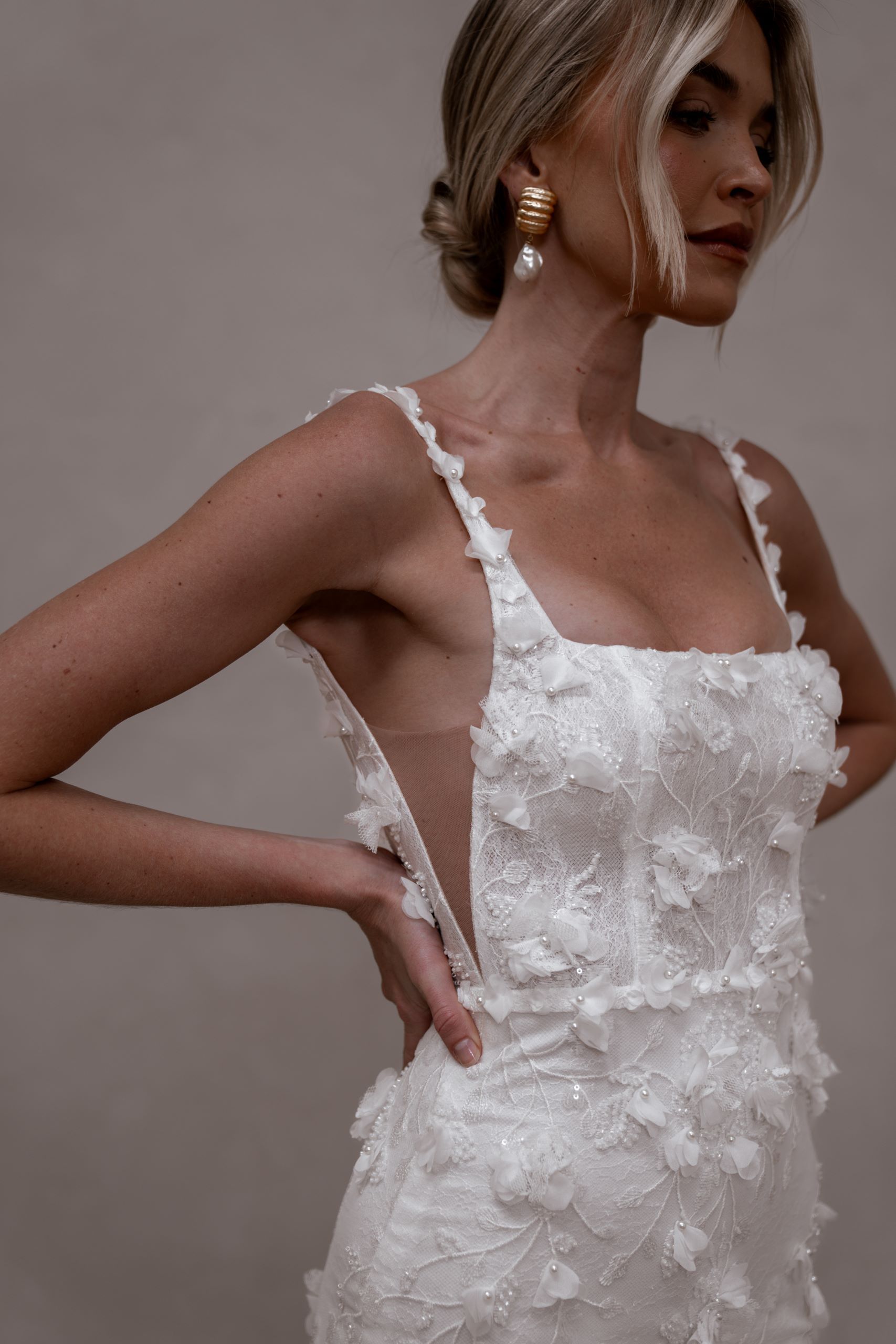 Atlas features a strong square neckline that adds a contemporary edge, framing the face with a bold and striking line. This architectural detail is complemented by her signature low back that exudes allure, showcasing a graceful illusion cut-out and delicate button detailing.