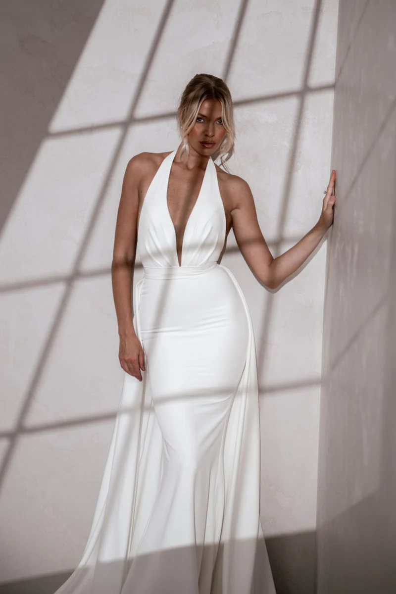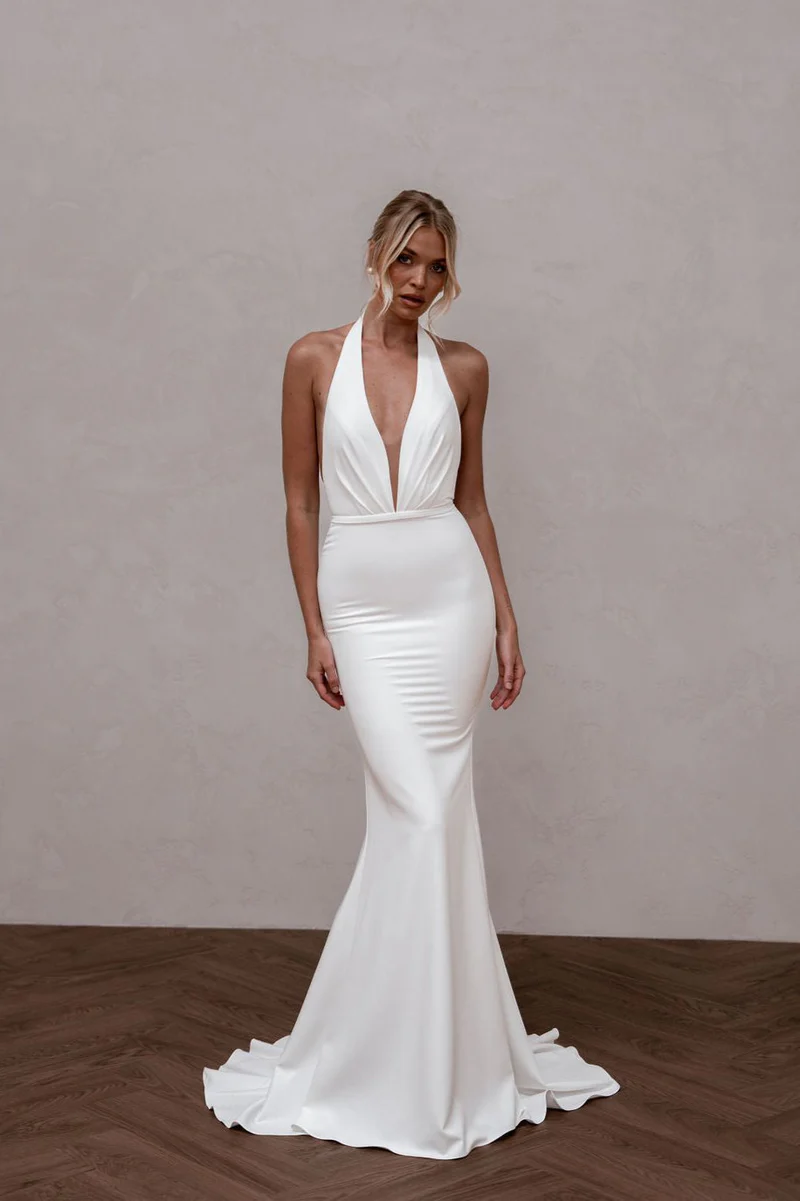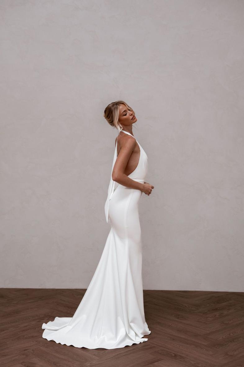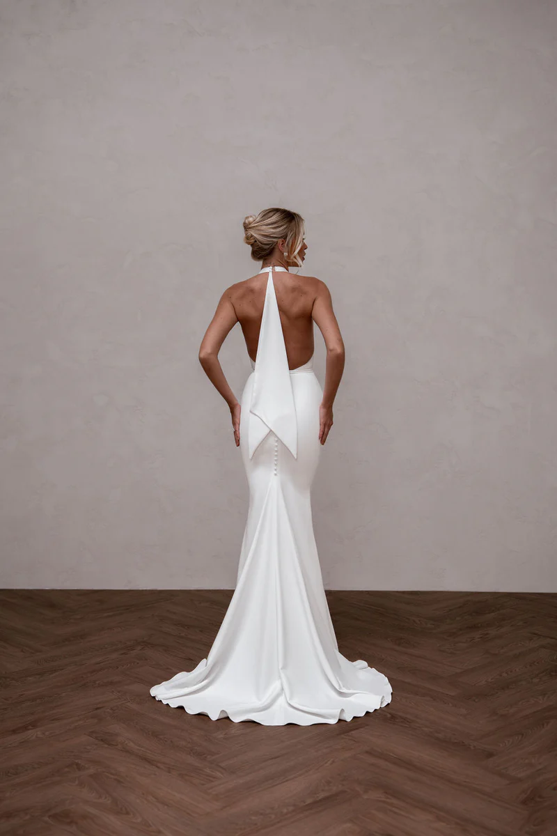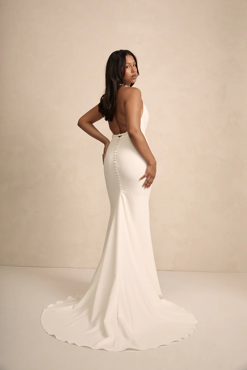 Audrey blends a striking backless design with MWL’s iconic plunging neckline and a removable crepe belt for a subtle cut-out effect. Crafted from supportive French Crepe, Audrey hugs curves beautifully and is comfortable for both the aisle and the dancefloor.k.