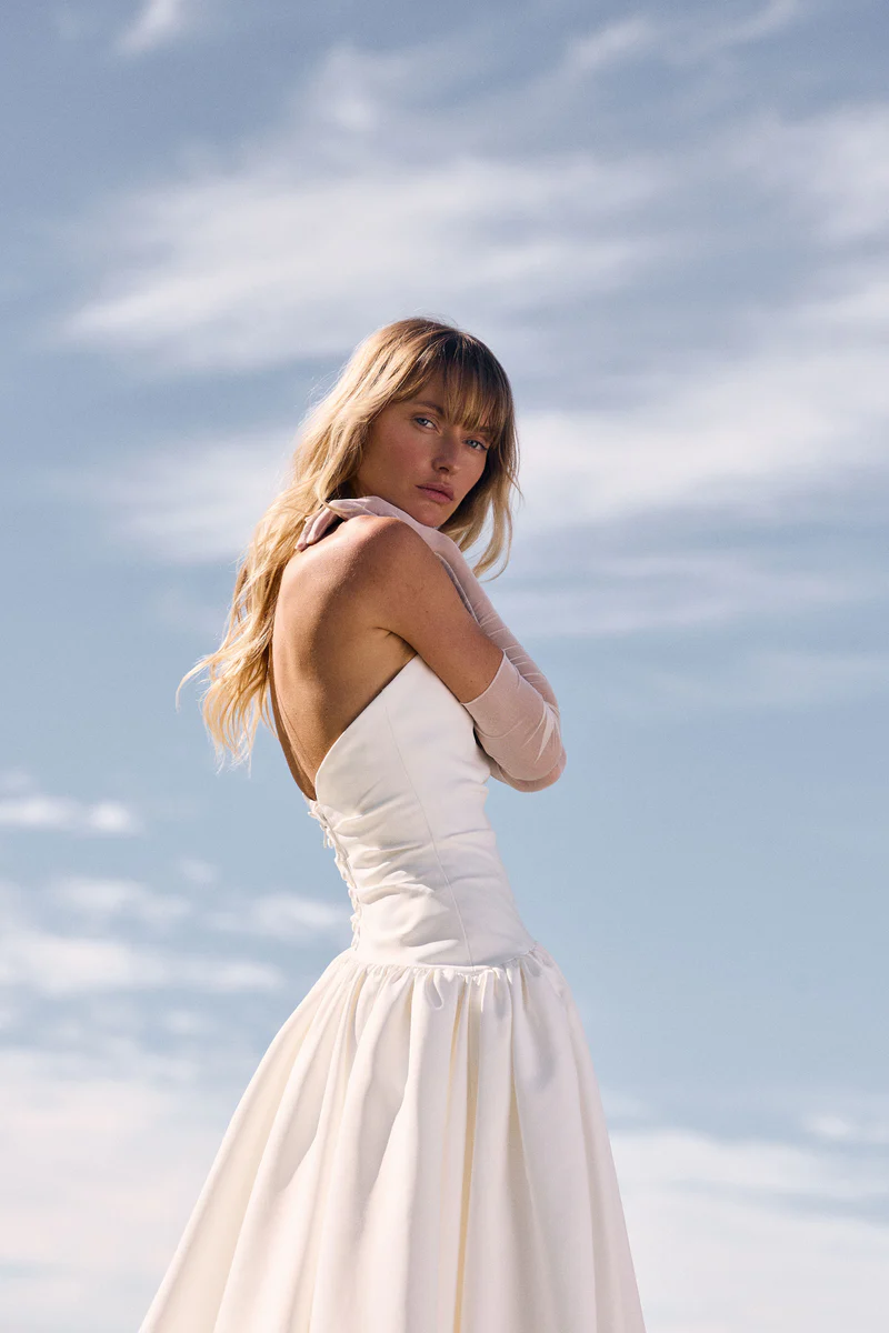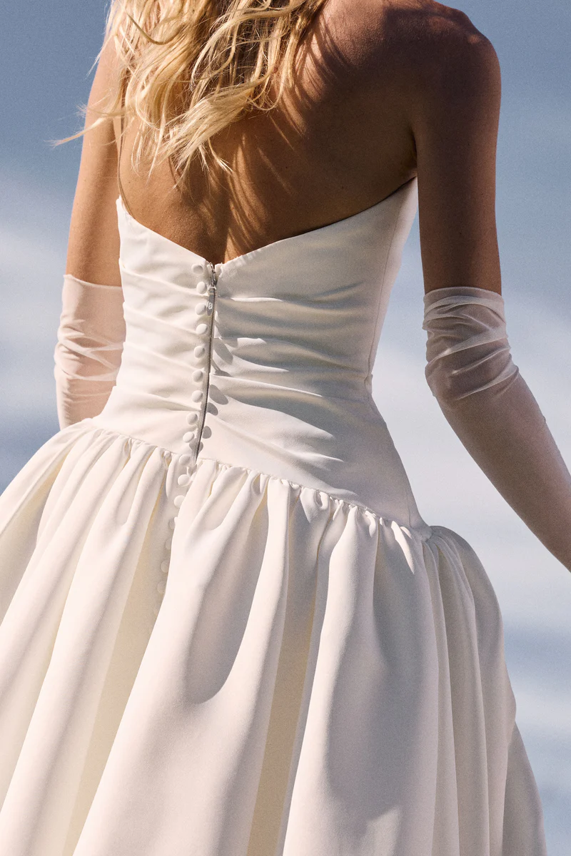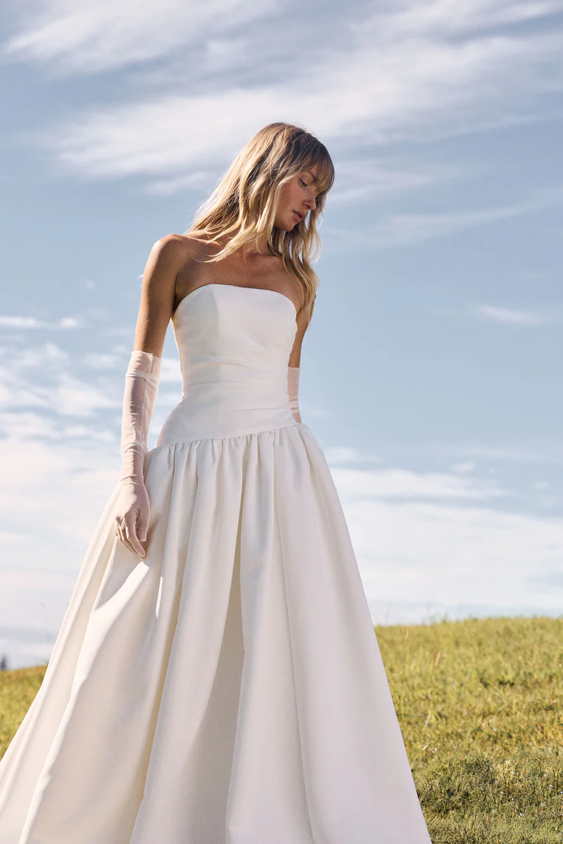 Avery features a sculptural silhouette, with an intentional asymmetrical waist complemented by a tailored strapless bodice. Creating a balance of romantic minimalism, Avery is masterfully draped in our brand-new matt duchess satin which is effortlessly soft and invokes luminous movement with every step.