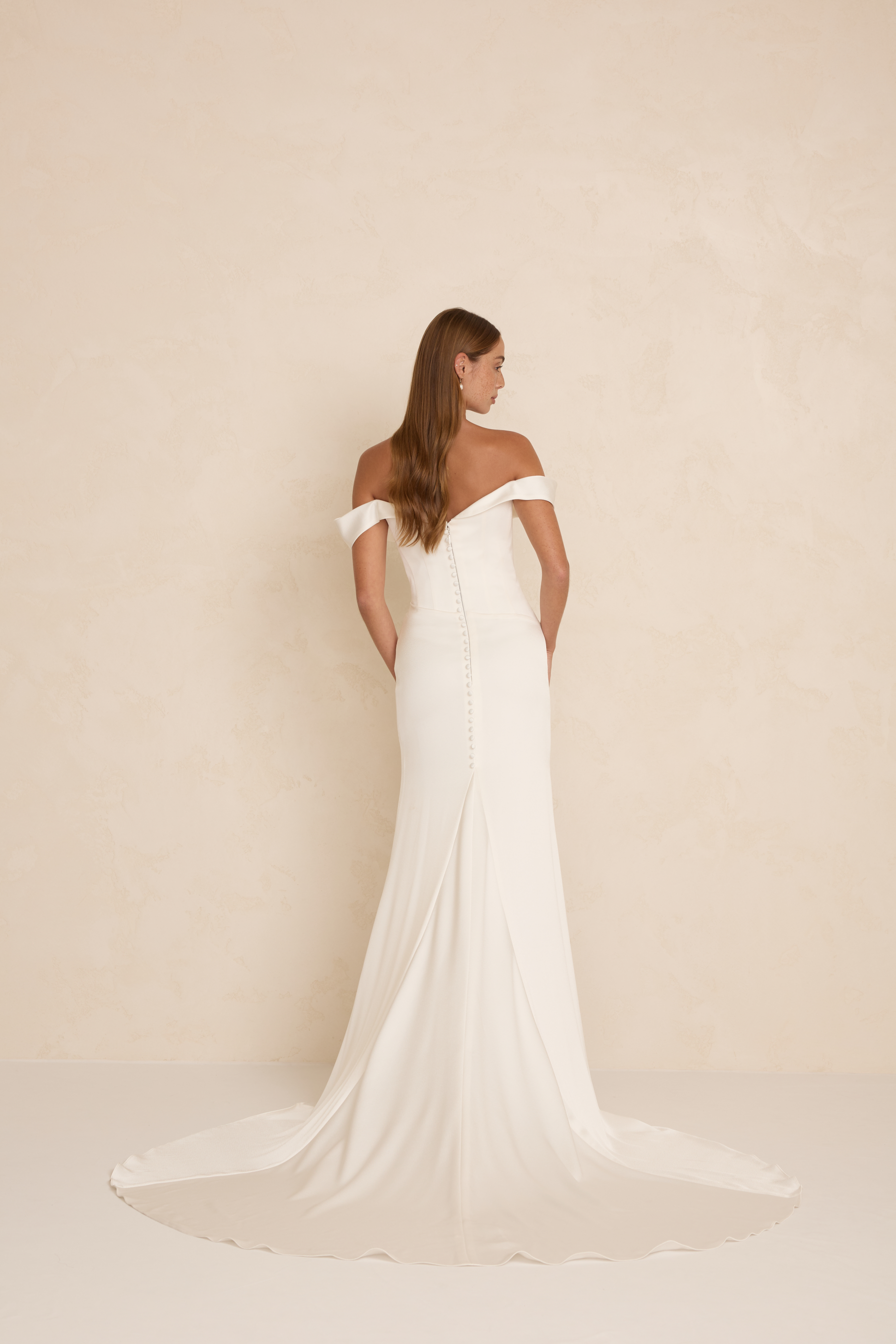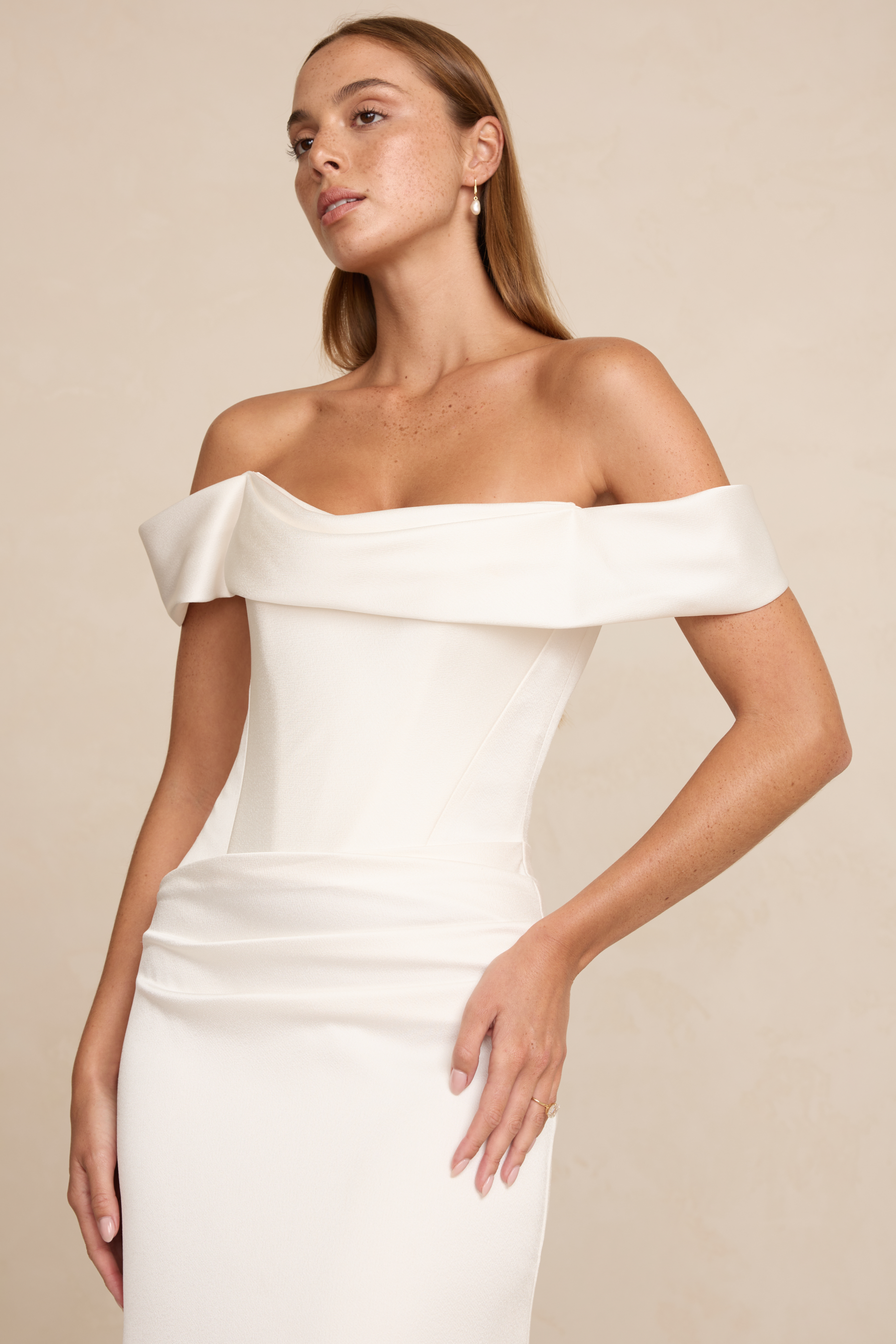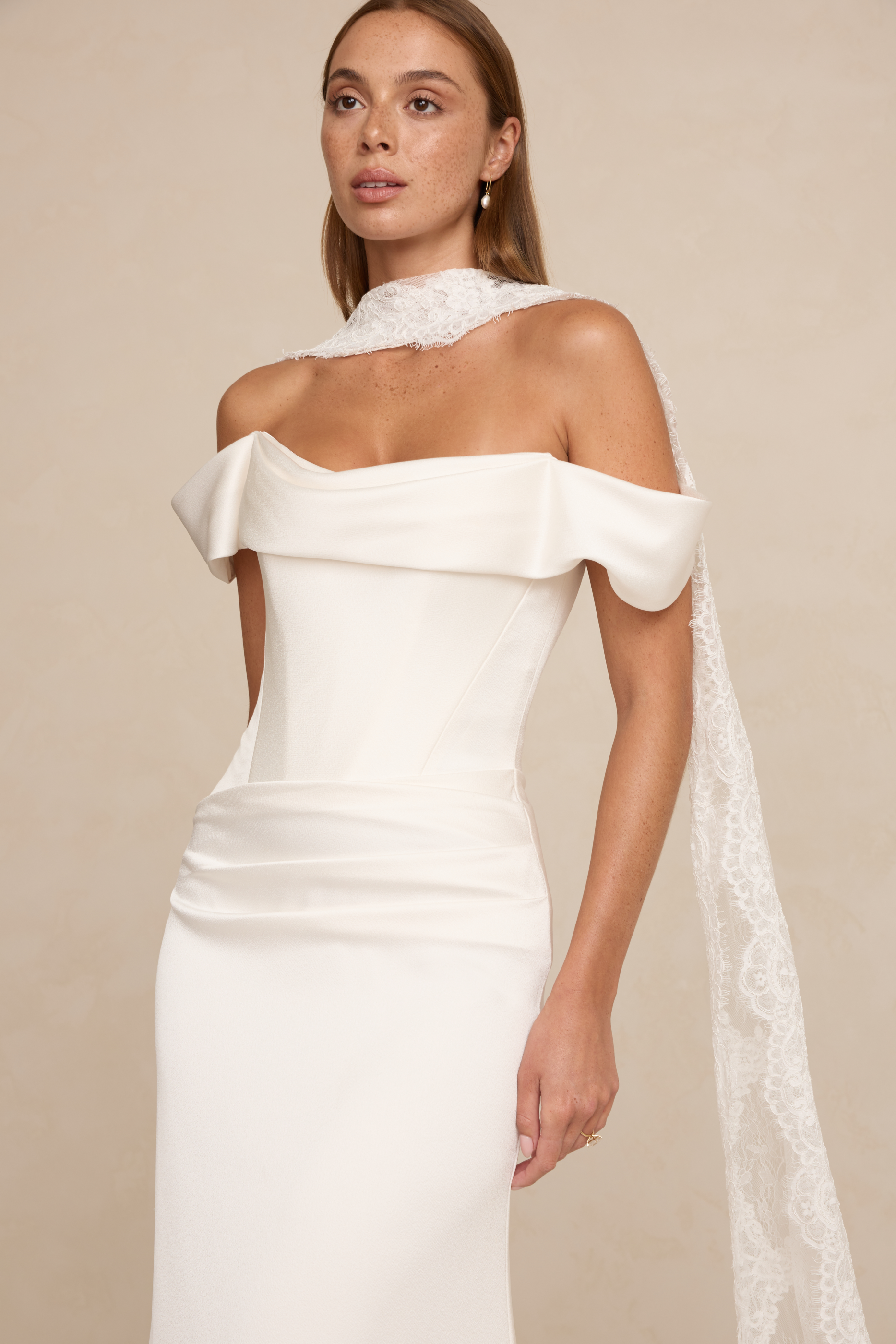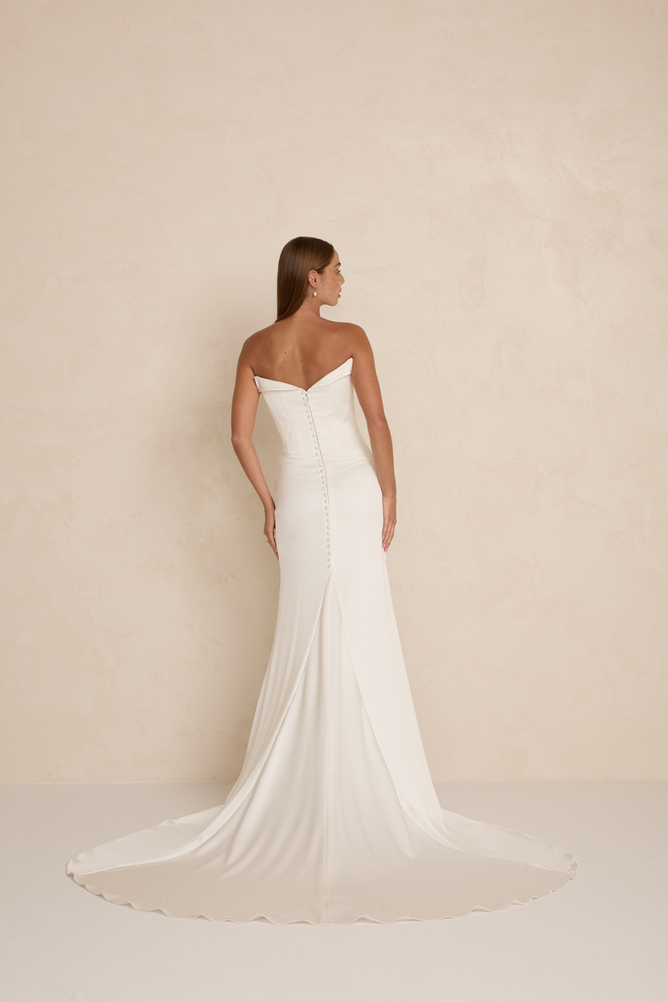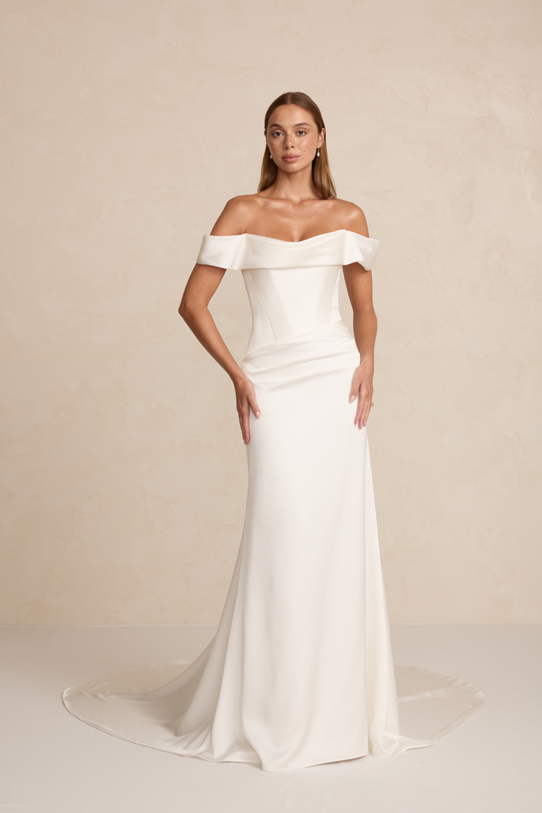Brooks is crafted from luxurious satin crepe, featuring an asymmetrical waistline, a structured boned bodice, and a soft front cowl. A sleek column skirt with four pleats creates an elegant, elongated silhouette.