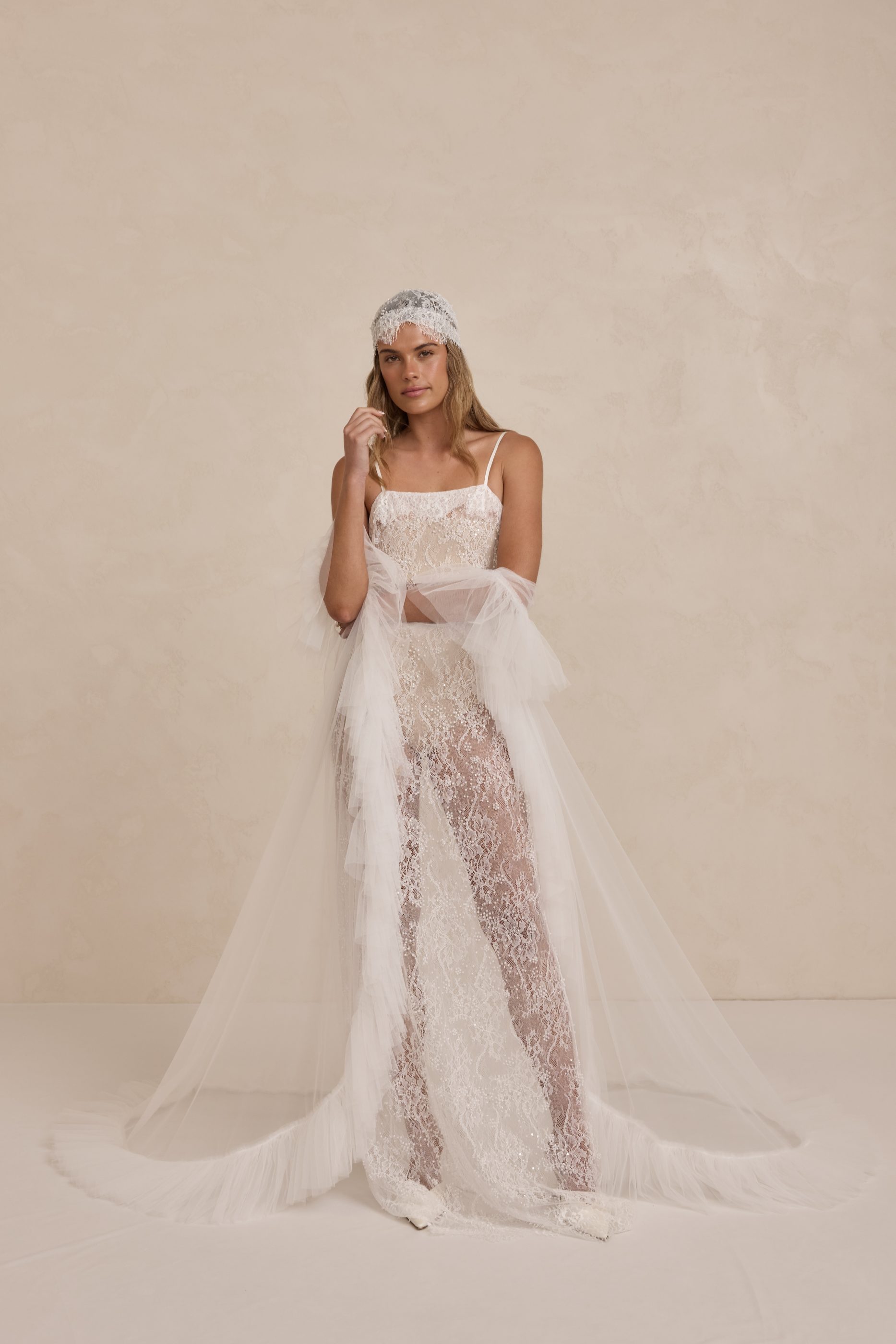 The Conrad Cape is the embodiment of romantic drama, with two tiered ruffles layered delicately to create a fuller, more textured effect. Crafted from our signature MWL ivory tulle, this breathtaking piece flows with grace, measuring 3 meters in length and 1.5 meters in width, designed to rest softly at mid-arm. Its ethereal design adds a touch of enchanting elegance, perfect for the bride who seeks both drama and romance.
