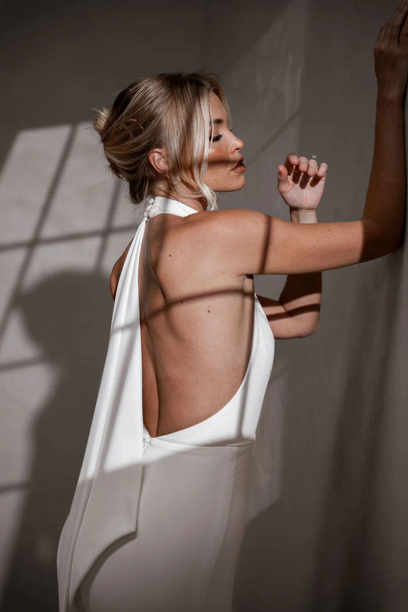 Our brand new Crepe Ties create a modern spin on our otherwise classic high-neck crepe designs Audrey and Grayson.  Attaching with a small elastic around existing buttons at the neck, these ties add an ethereal, graceful effect and point of interest to the back of our favourite open-back beauties.