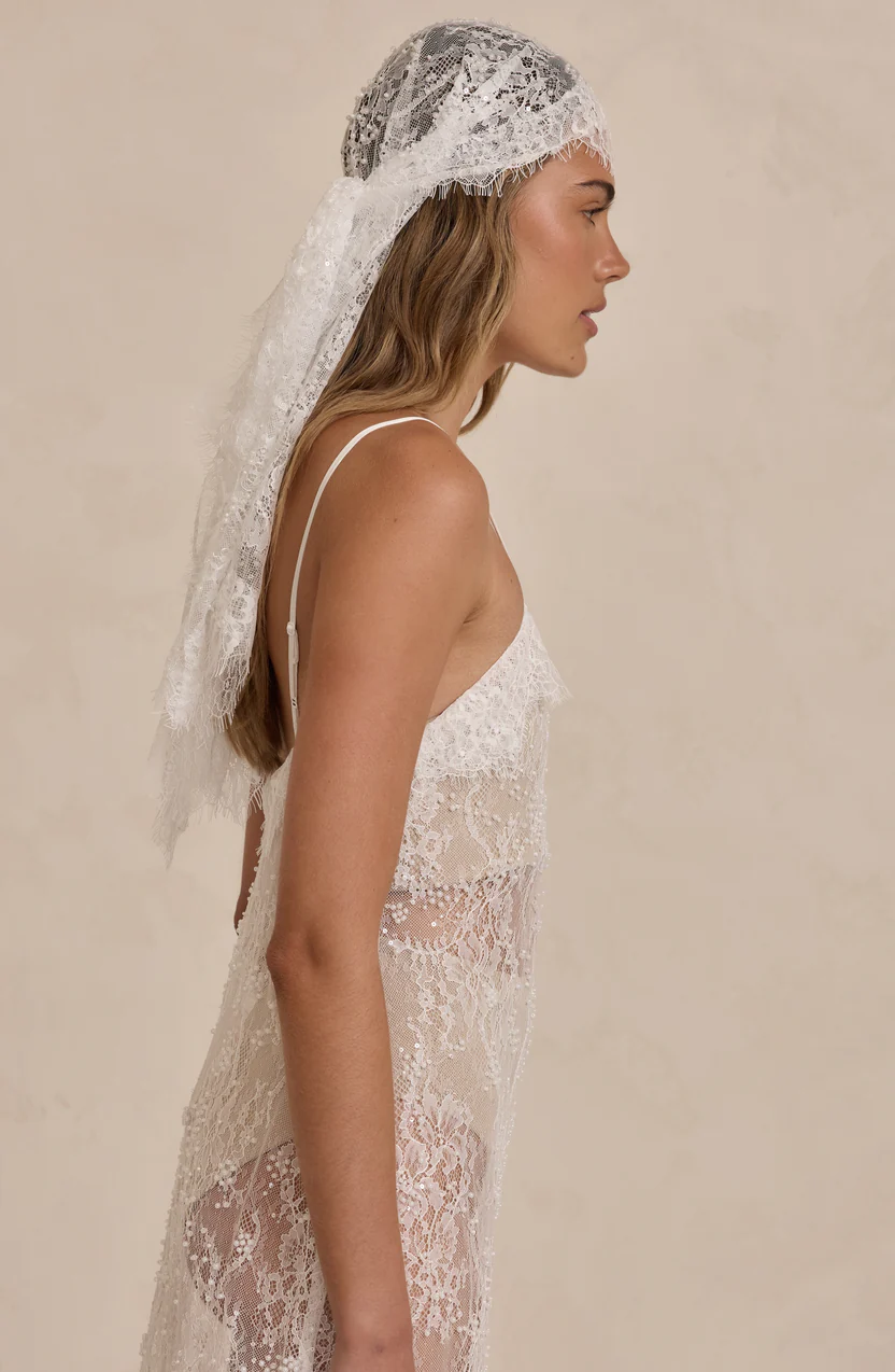 Soft, romantic, and effortlessly cool, the Della Head Scarf is perfect for modern brides. Crafted from our signature Haven lace, it can be worn as a chic headscarf and secured with a discreet clasp.