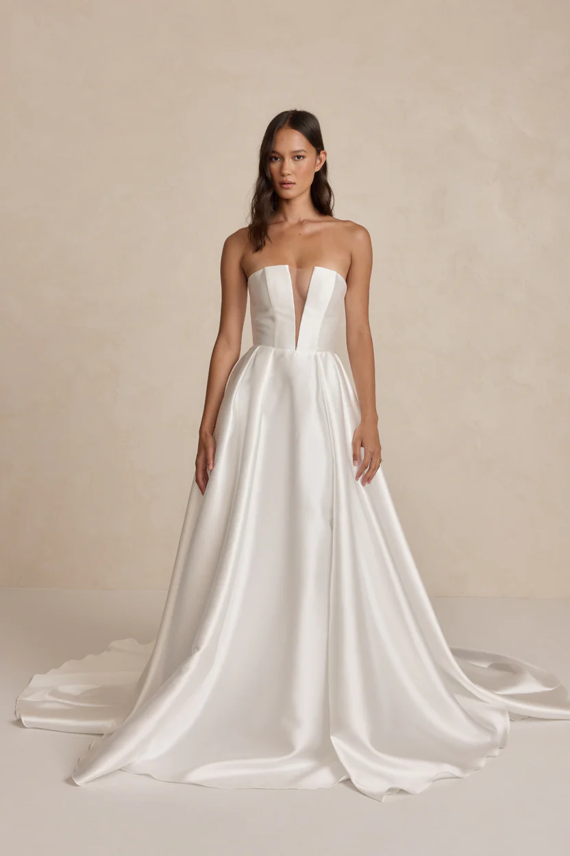 Florence features a structured Mikado bodice with MWL’s signature plunging neckline. Her full skirt with a thigh-high split and hidden pockets adds bold, timeless drama.