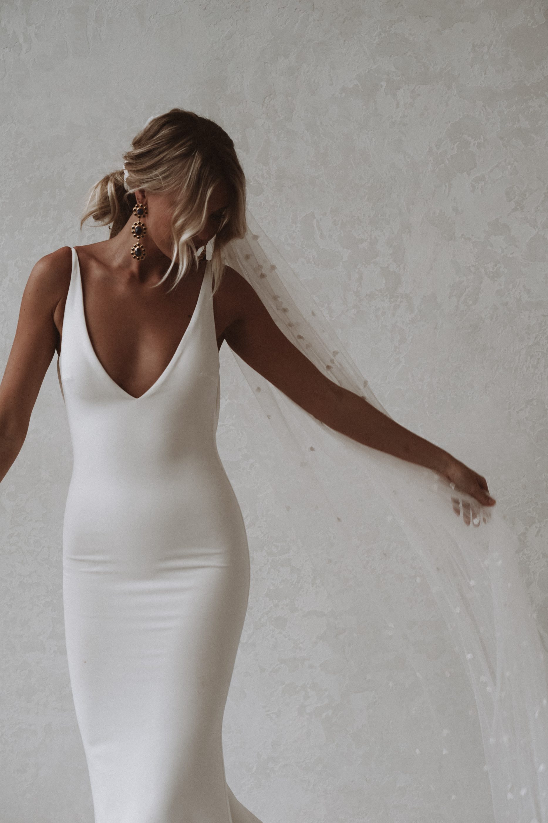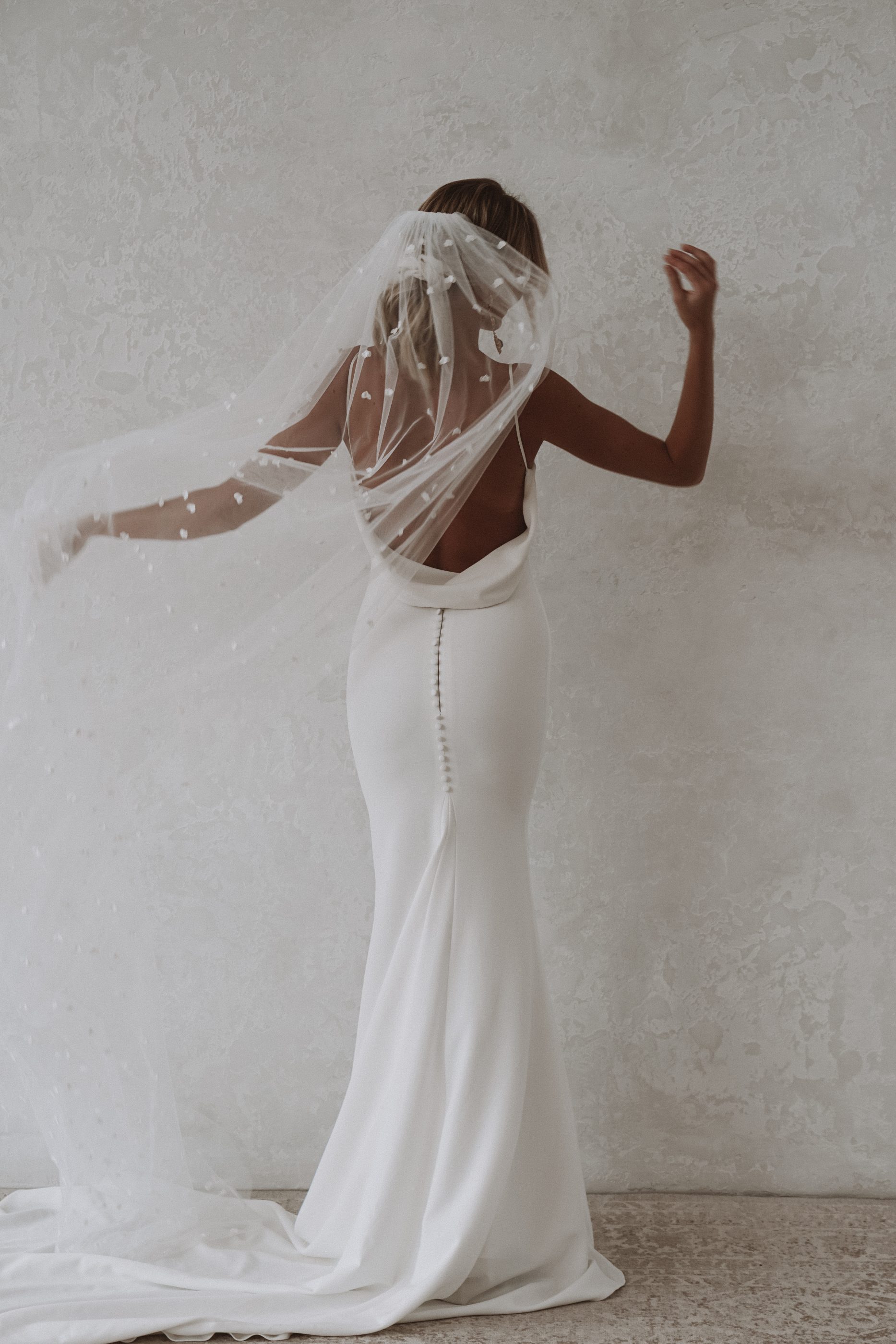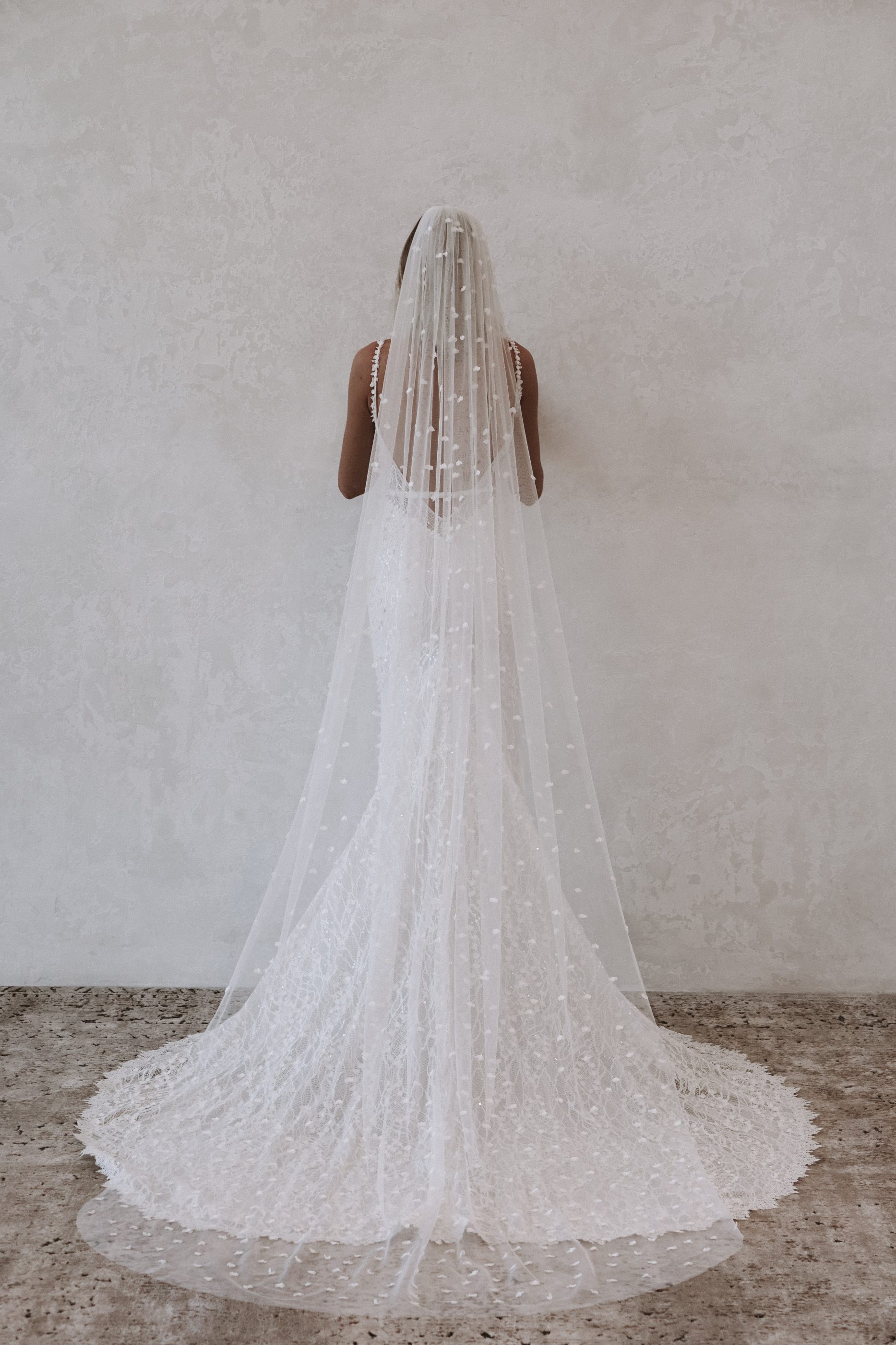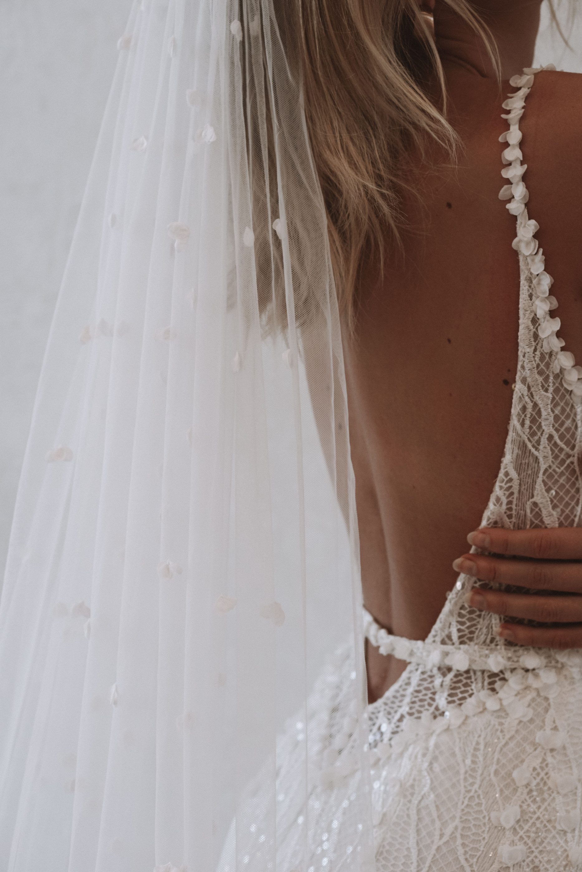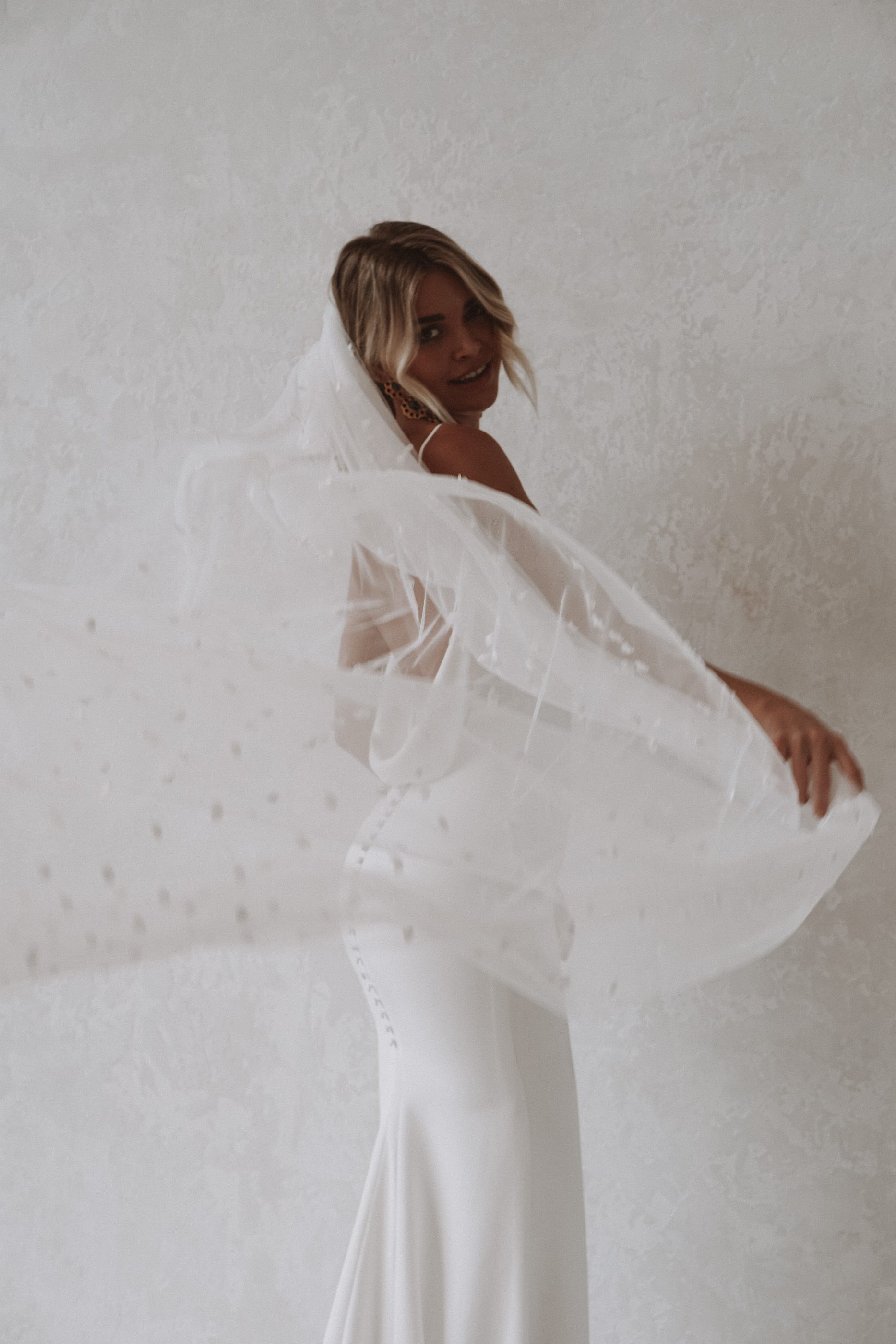 Our Harlow Veil is a single layer, 3m cathedral length veil with 3D flutters from the gorgeous Harlow lace. She is the perfect match for our Harlow dress along with all of our beautiful crepe dresses. The Harlow Veil comes attached to a comb so it can easily be placed on your hair.