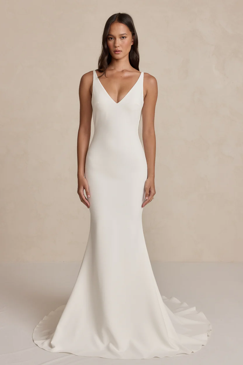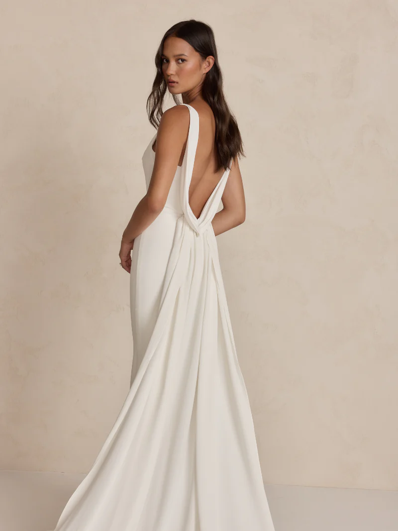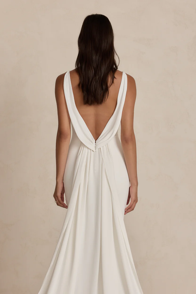 Harry’s plunging draped back, detachable train, and figure-hugging silhouette create a breathtaking combination. Designed for the confident, timeless bride that is looking for versatility on her big day.
