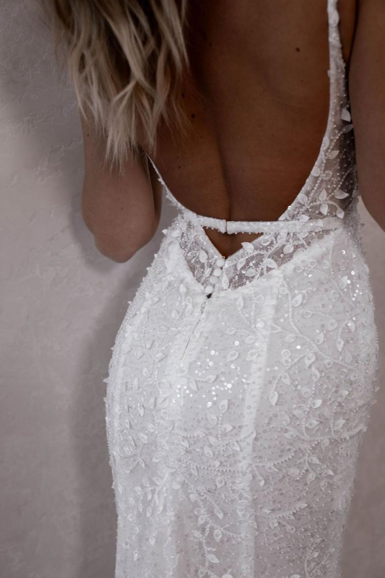 Featuring our deep plunging neckline to the waist, illusion sides and iconic low back in a much loved, rich beaded lace, Hudson is an unstoppable force. Â She is sexy and modern and her detachable soft tulle bows add the perfect touch of femininity. Her removable belt, paired with her sheer feature low back is the perfect combination to snatch the waist and accentuate every bride’s curves. Â The cherry on top of this stunning design is her statement long, sheer train that gives her gorgeous beaded lace the perfect opportunity to shine as you glide down the aisle.
