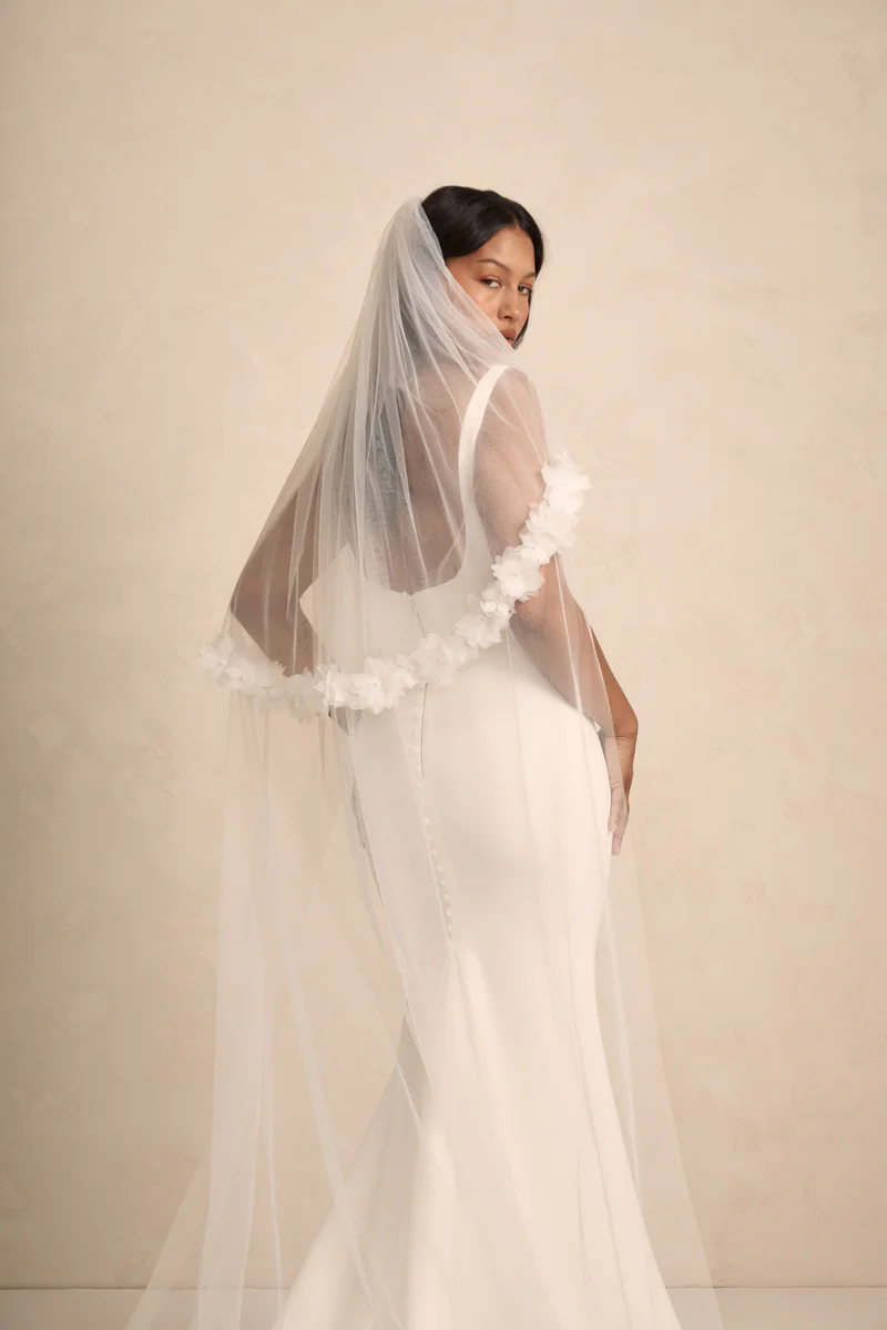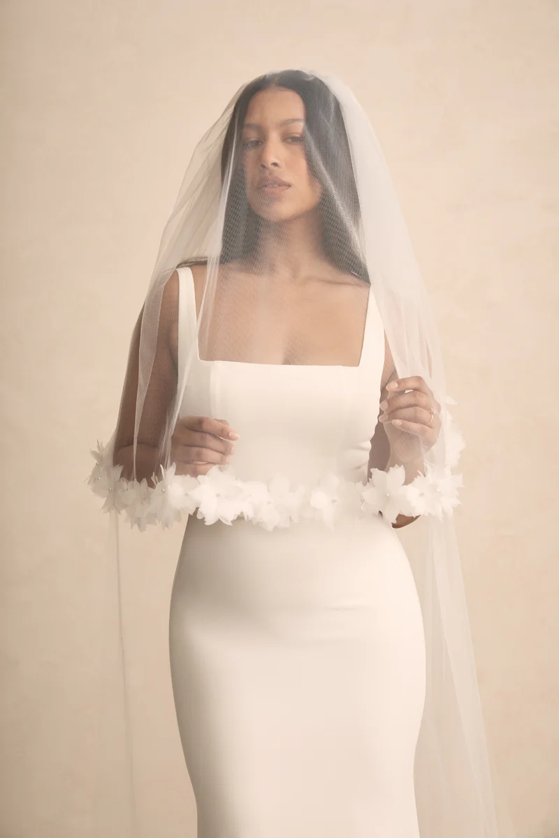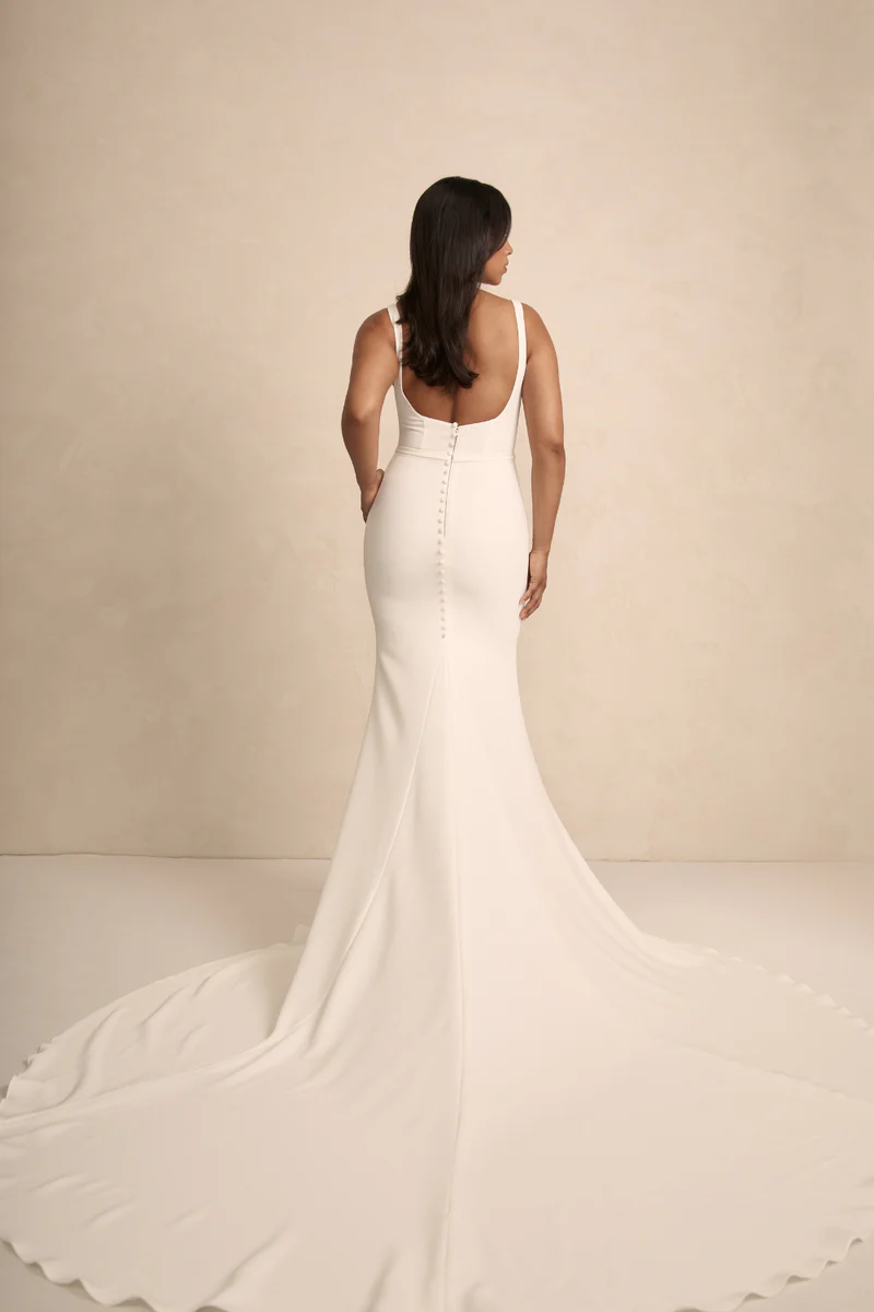Hunter features a highly requested square neckline, illusion tulle cut-outs, and a higher square back with figure-flattering buttons. Crafted from iconic French crepe, this design beautifully frames the bust, offering a flattering look for all MWL brides.