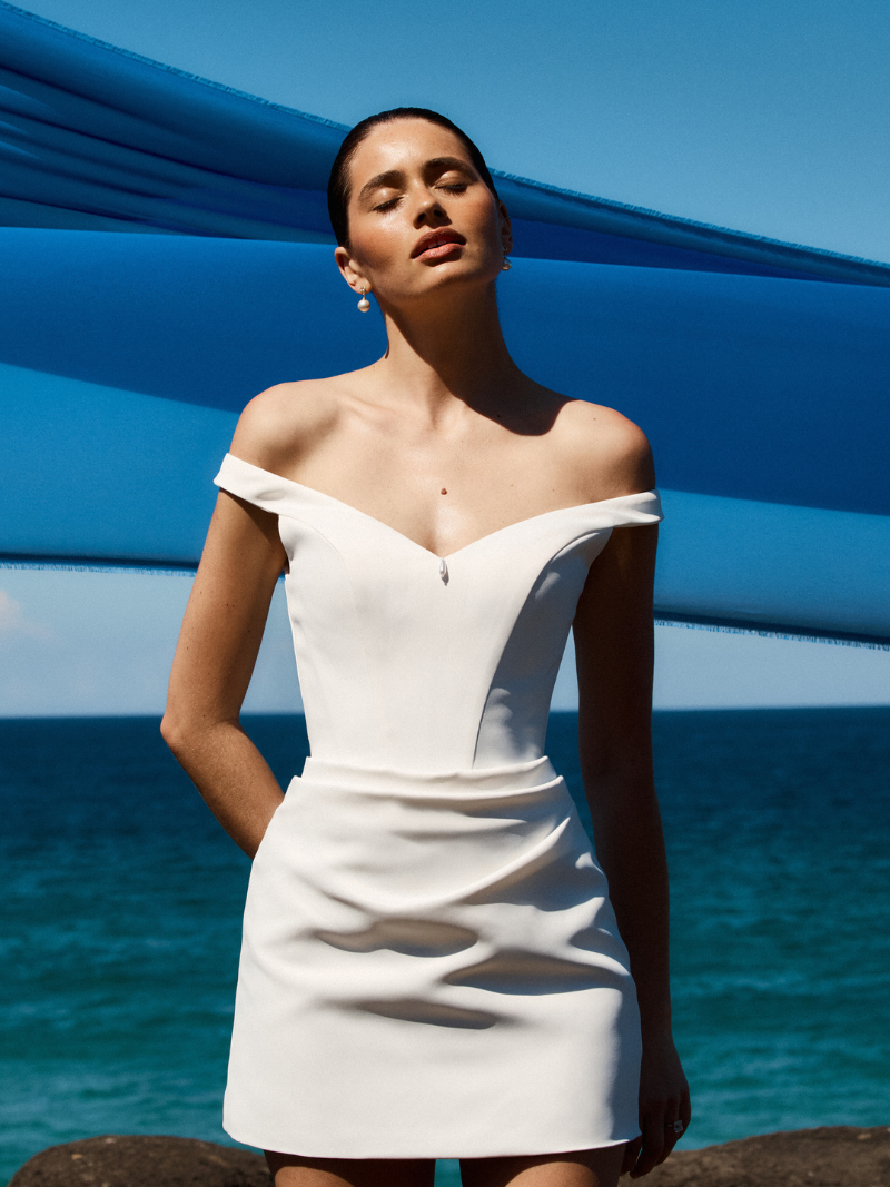 The Jett Mini is a sweet and spirited take on our beloved Isla gown, thoughtfully reimagined in a shorter, more playful silhouette. Crafted from our luminous Avery Satin, it drapes with a gentle sheen, offering a look that feels effortlessly modern and timelessly elegant. At the centre of the bodice, a single teardrop pearl glows softly, a delicate detail shared with the Scout and Tanner gowns that brings a quiet romance to the design.