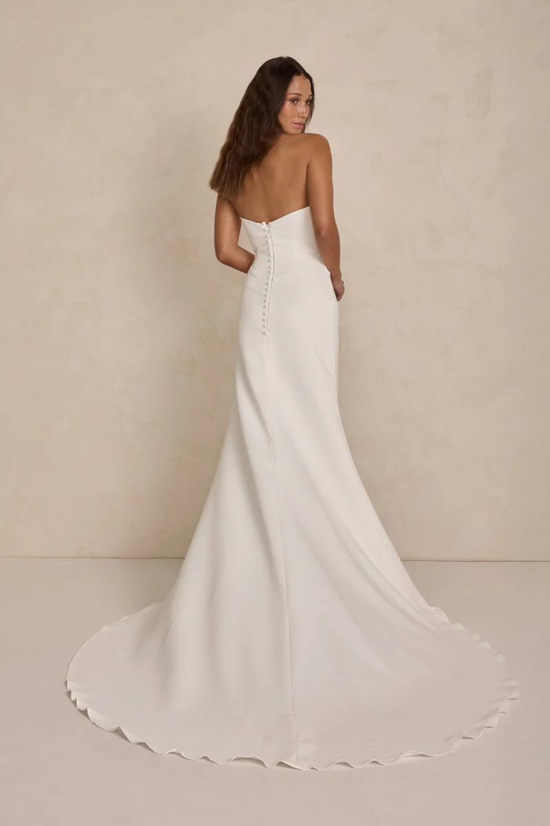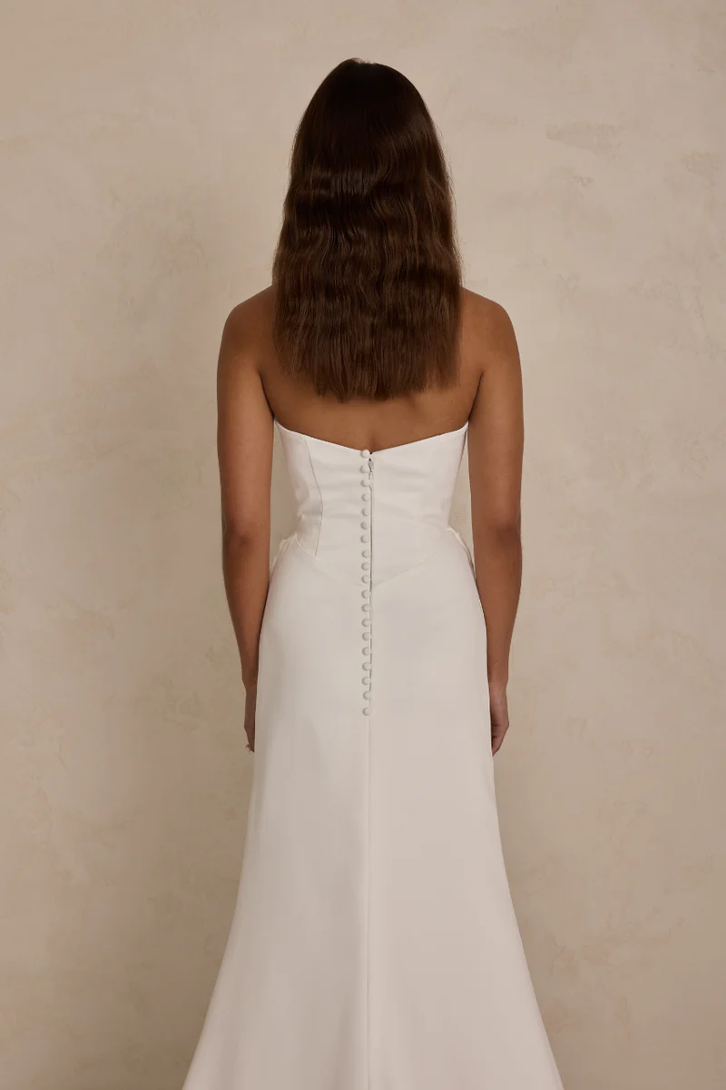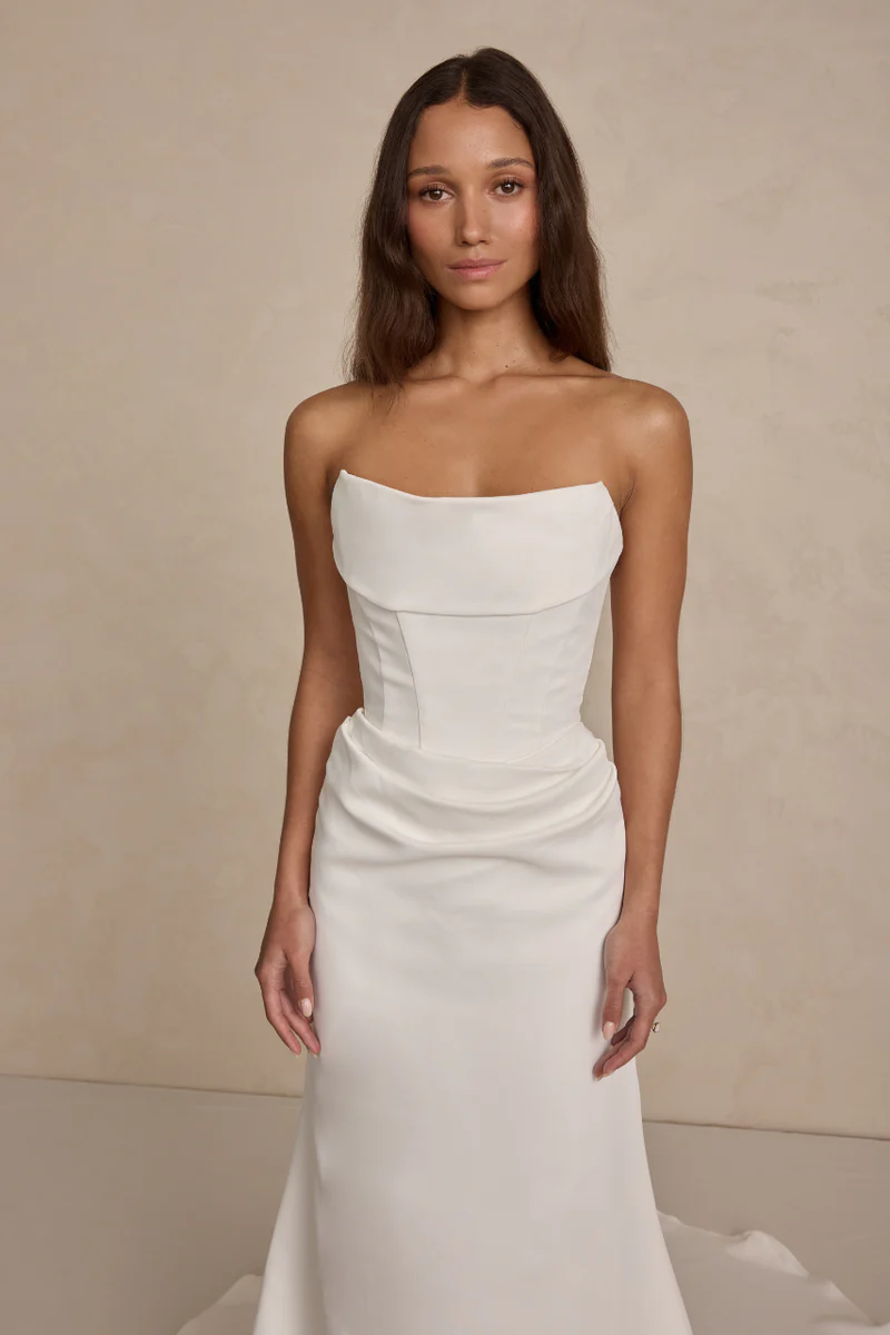 Elegant and architectural, the Knox is a fresh take on timeless sophistication. Featuring a newly developed bodice pattern inspired by our iconic Celine dress, Knox offers a refined silhouette with internal boning for structure and support. A soft, sculptural cowl detail graces the front bodice, adding a touch of modern romance.