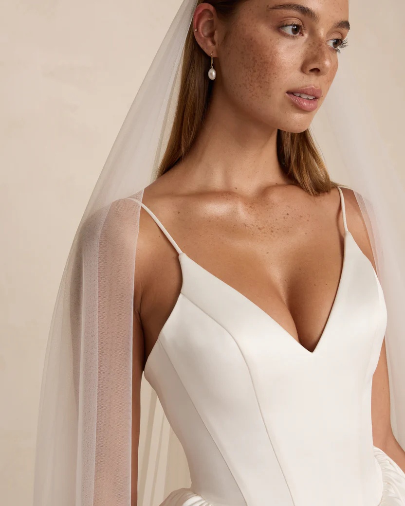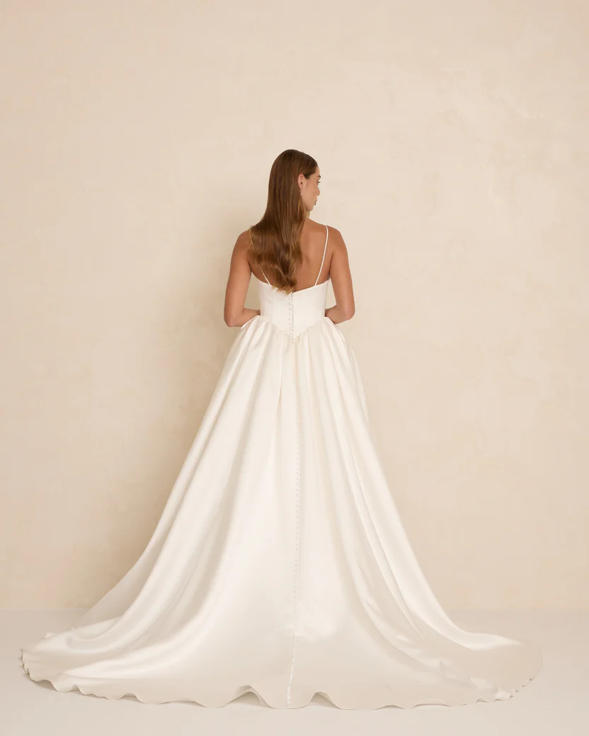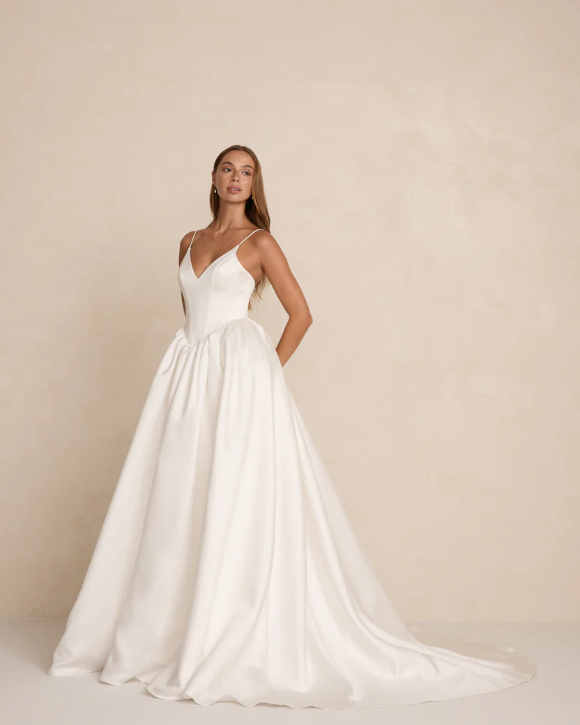 Lake embodies modern bridal elegance, crafted from luxuriously soft duchess satin with a subtle V neckline that flatters. The flowing skirt creates beautiful movement, designed to feel both timeless and refined.