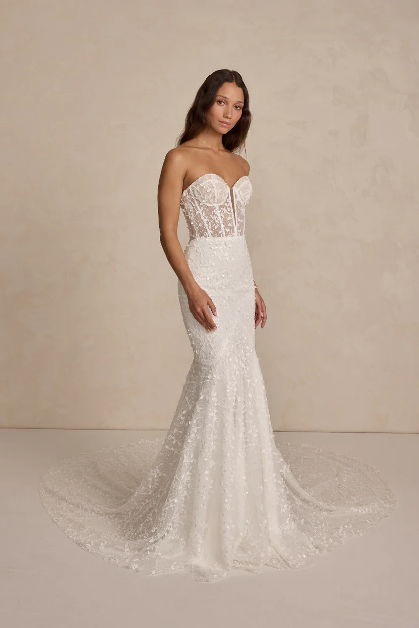 Ollie embodies MWL with a curve-hugging mermaid skirt, plunging neckline, illusion corset bodice, and delicate 3D lace and beading. Her low V back is finished with a line of ivory tulle buttons.