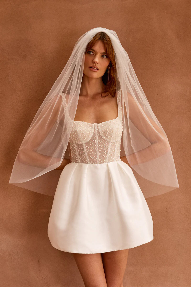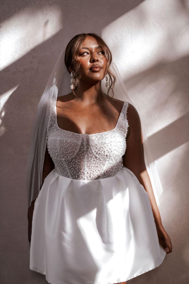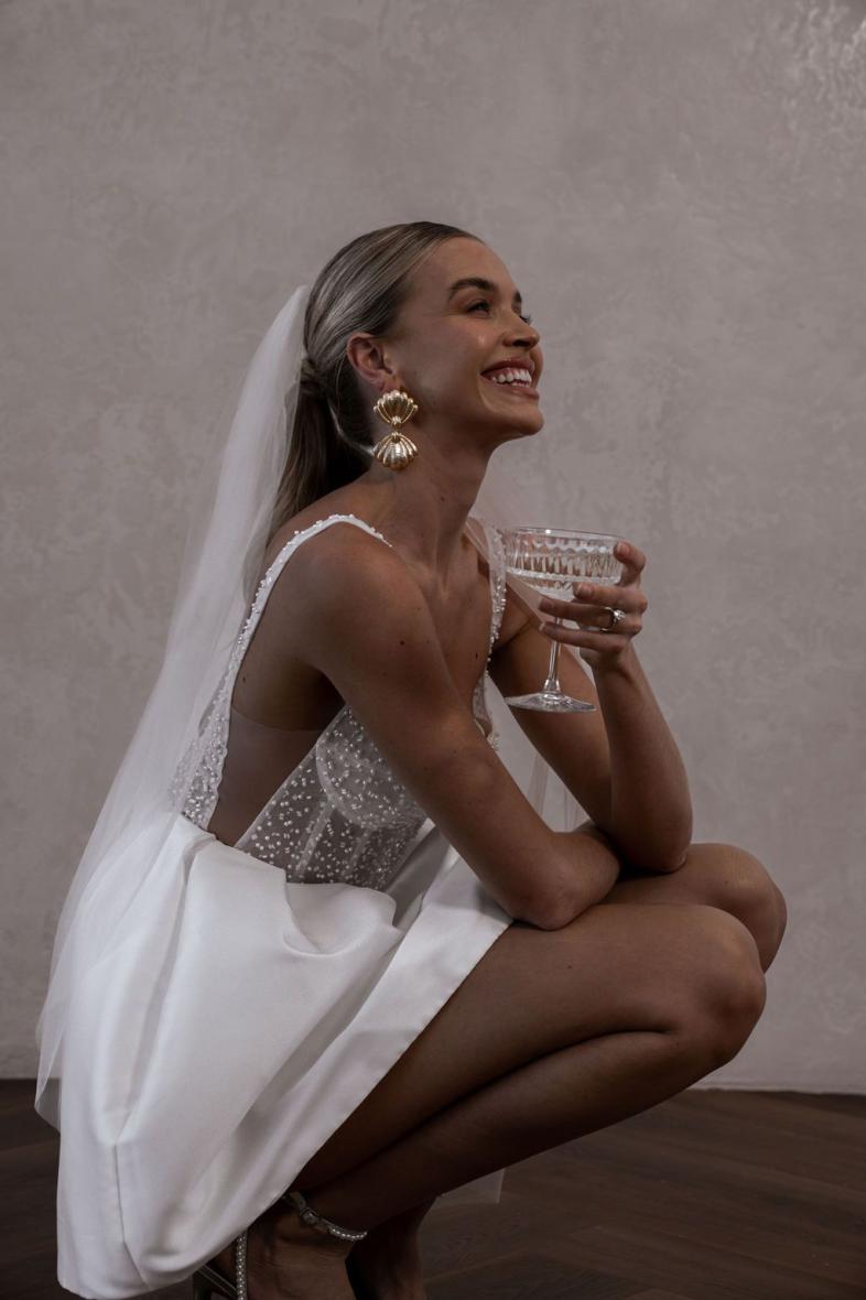Poppy perfectly encapsulates fun, youthfulness, opulence and modernity in the form of her sheer, pearlescent beaded, corset-like bodice and Mikado mini skirt lined to the zip with playful buttons. Designed with engagement parties, bachelorette nights and playful elopements in mind, Poppy is perfect party dress for our MWL Girls combining elements of some of our all-time favourite designs!