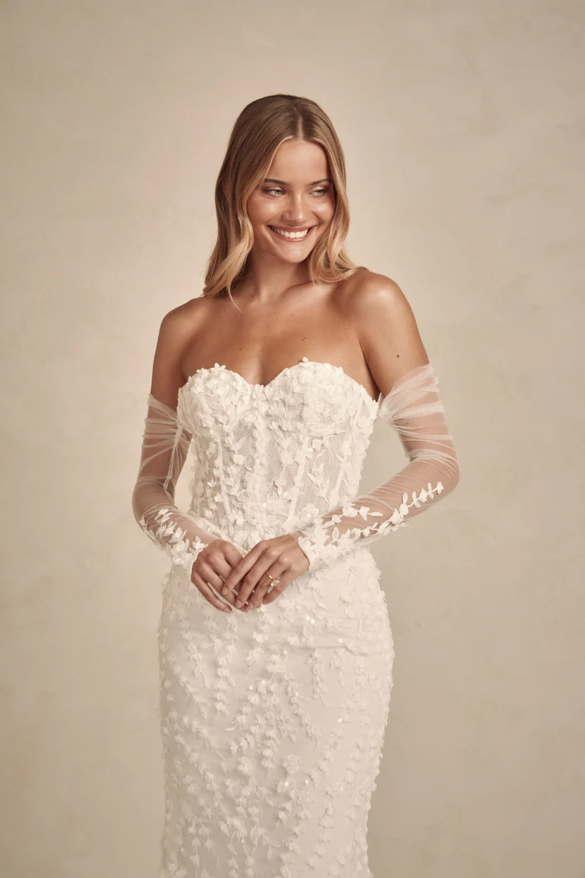 Posie combines sequinned 3D floral lace with a soft Chantilly underlay, featuring a strapless corset bodice and a figure hugging silhouette that exudes effortless romance.