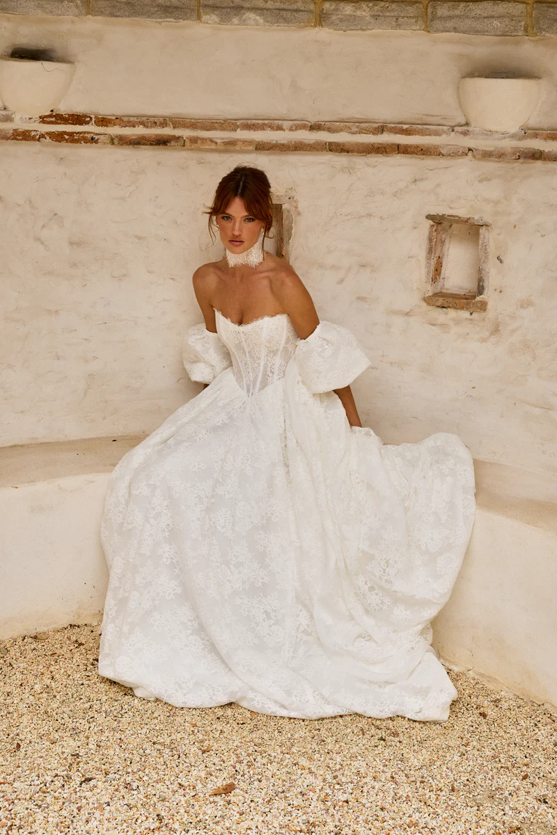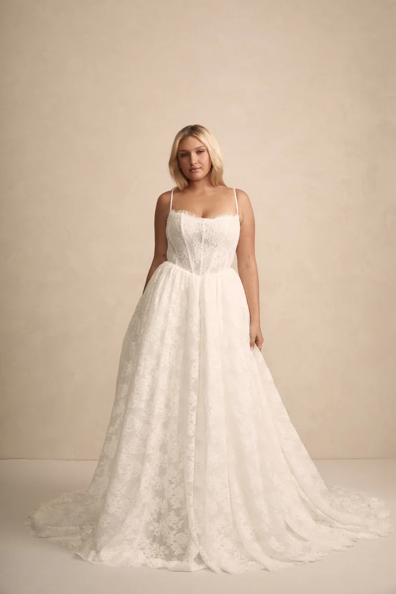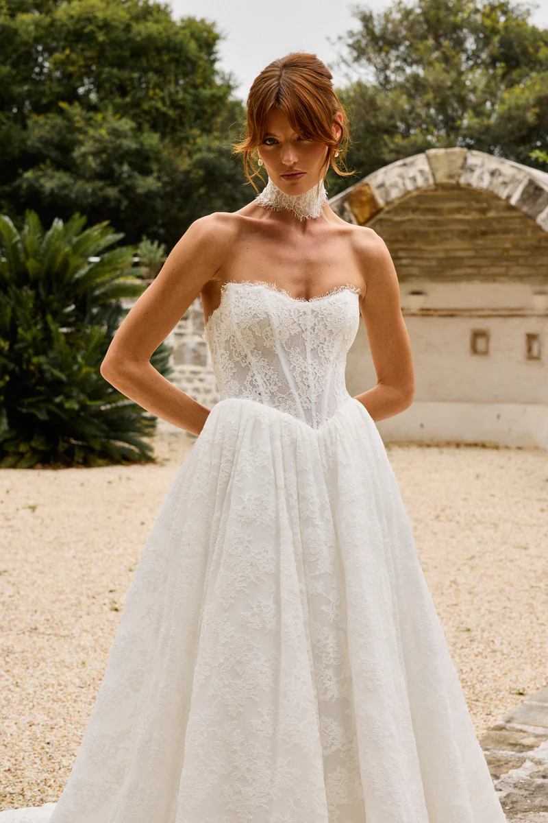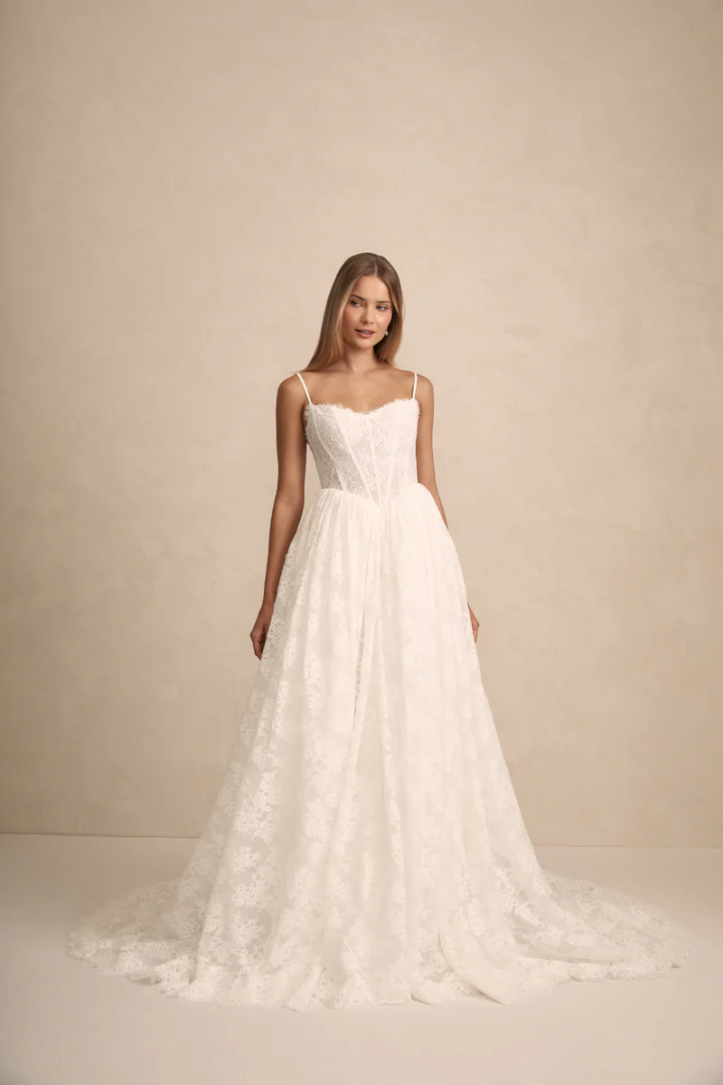 Prim features a flattering bodice with an on-trend Basque waist ensuring a flawless fit. She features internal boning and optional delicate straps that offer both comfort and sophistication. Her gathered skirts’ flowing lines and contemporary silhouette moves like a dream with every step!