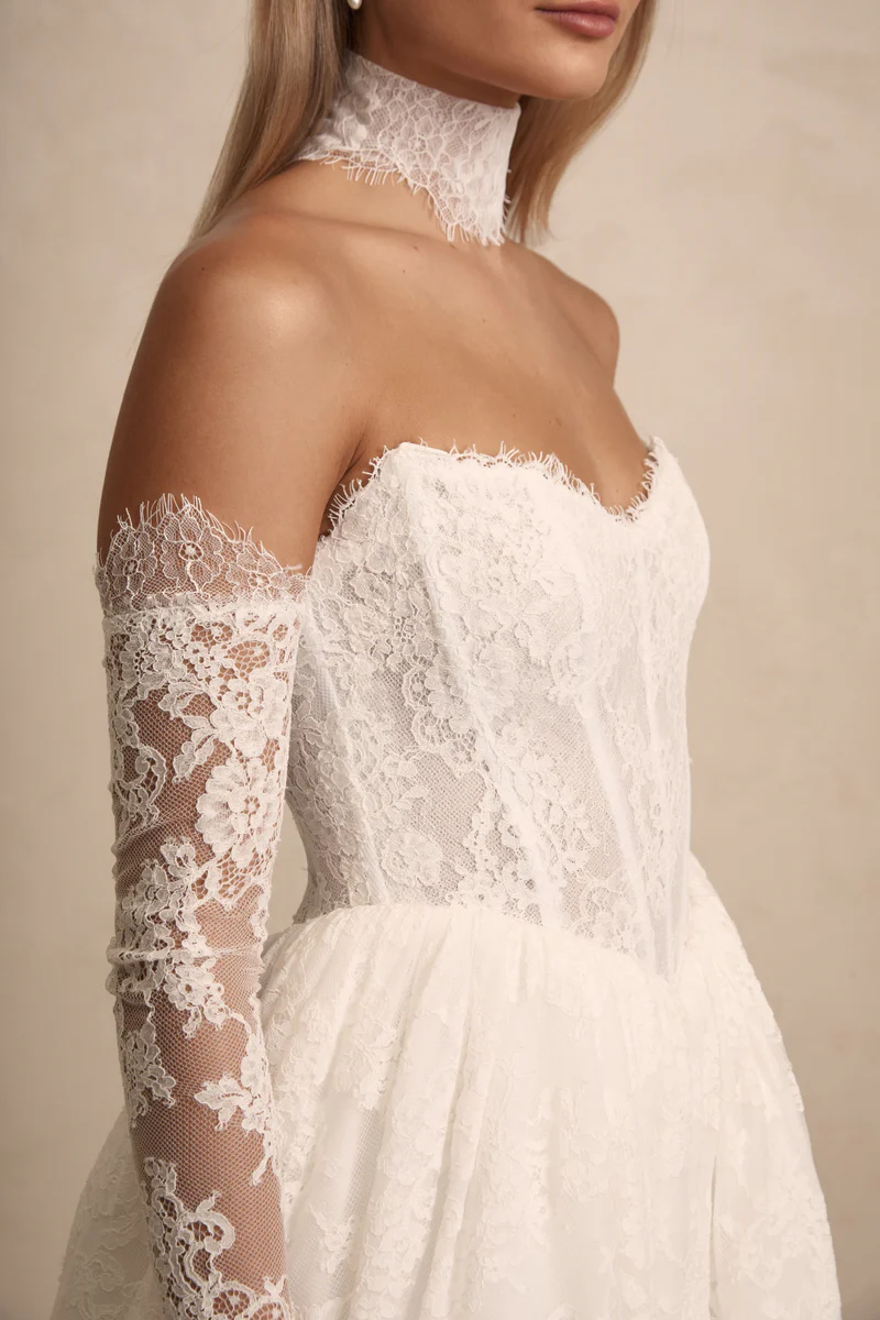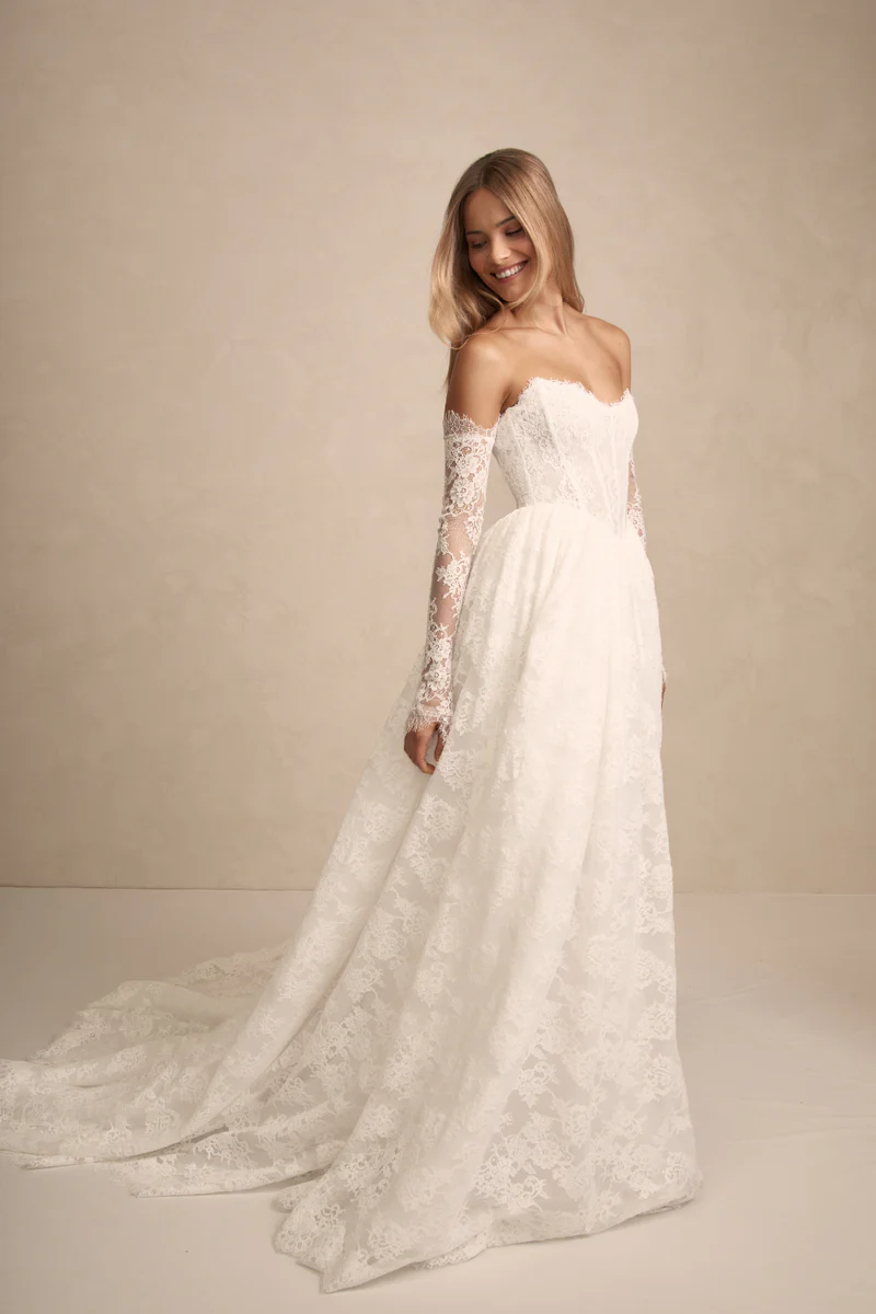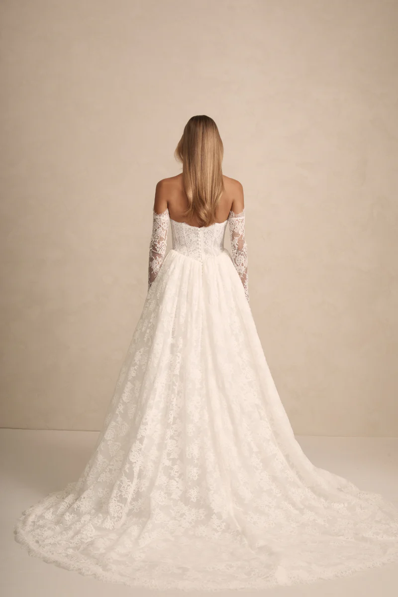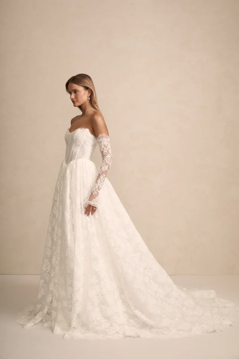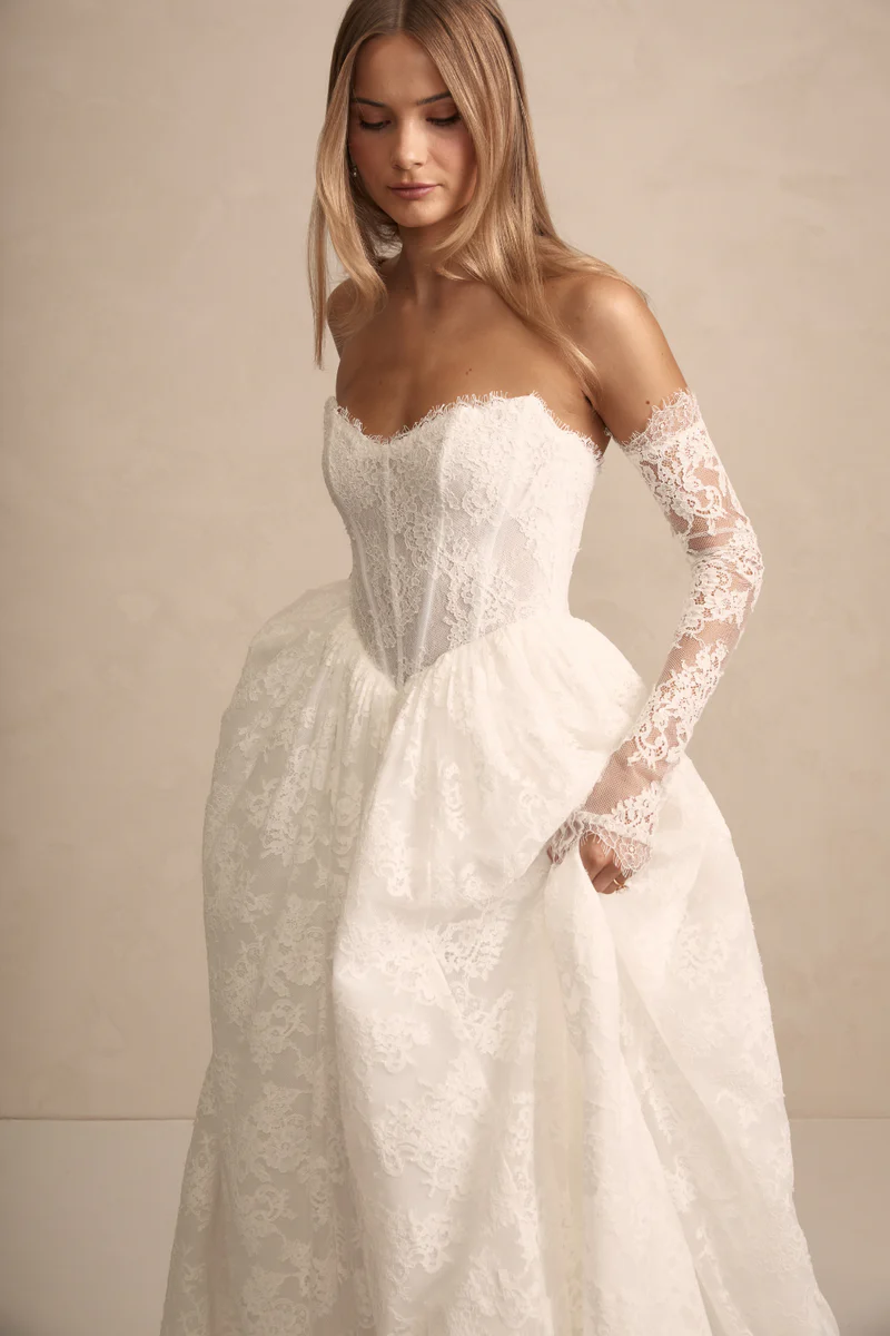 Prim features a flattering bodice with an on-trend Basque waist ensuring a flawless fit. She features internal boning and optional delicate straps that offer both comfort and sophistication. Her gathered skirts’ flowing lines and contemporary silhouette moves like a dream with every step!