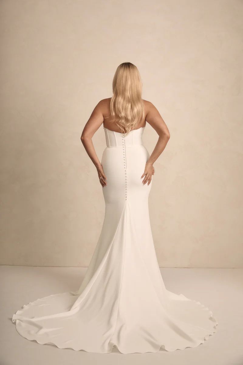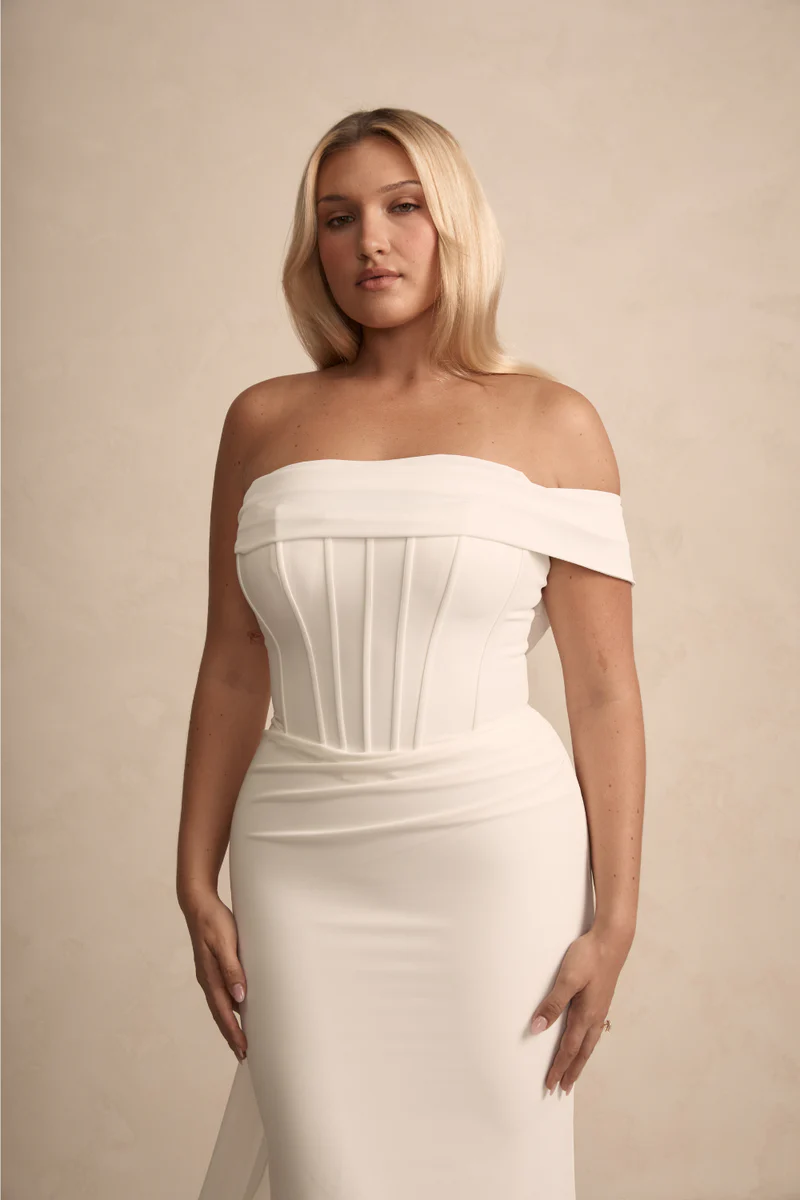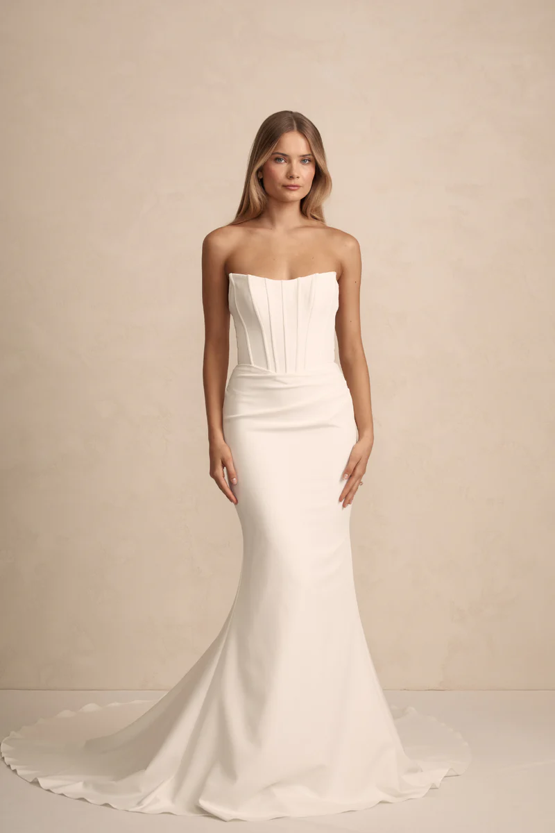 Rhode’s striking bodice features a peaked design at the bust with statement exposed boning, sculpting your silhouette with an alluring yet refined edge. Soft French crepe draping cascades gracefully from the waist to the hips, creating a flattering silhouette that moves beautifully with every step, keeping you comfortable and confident.