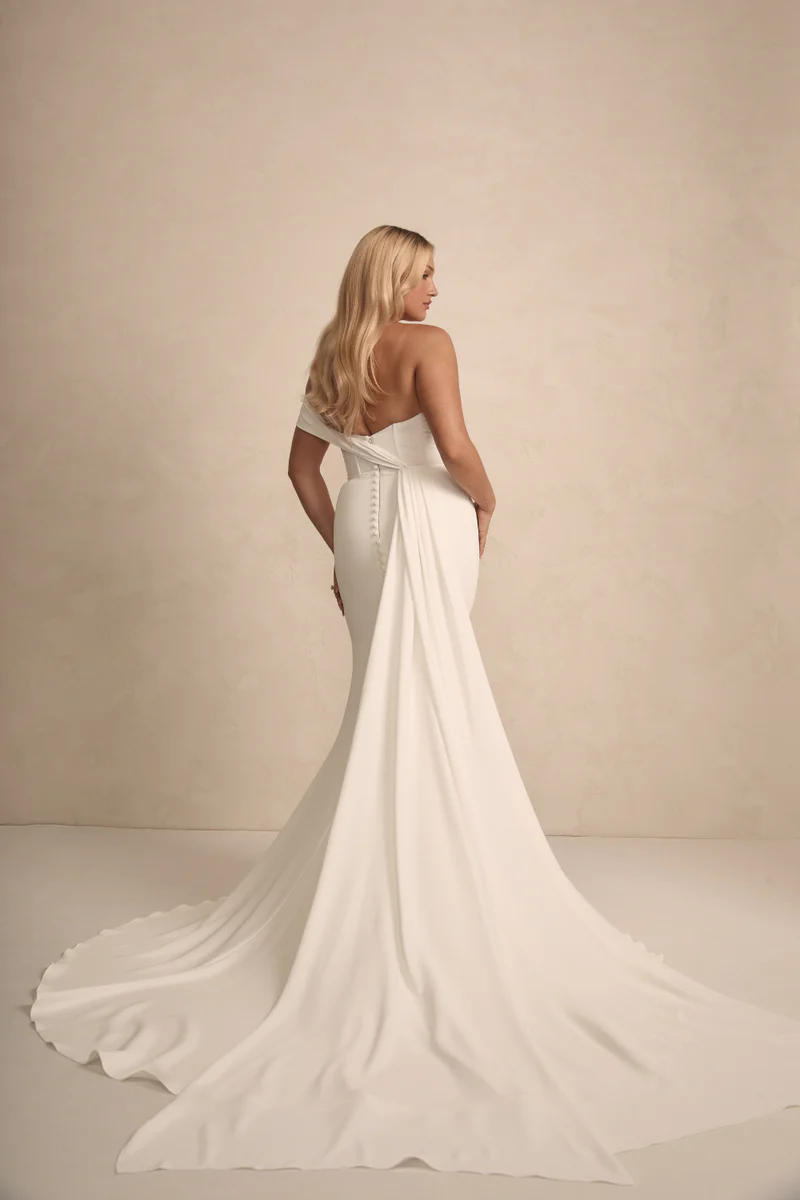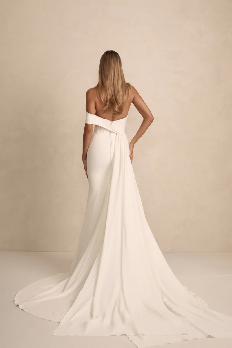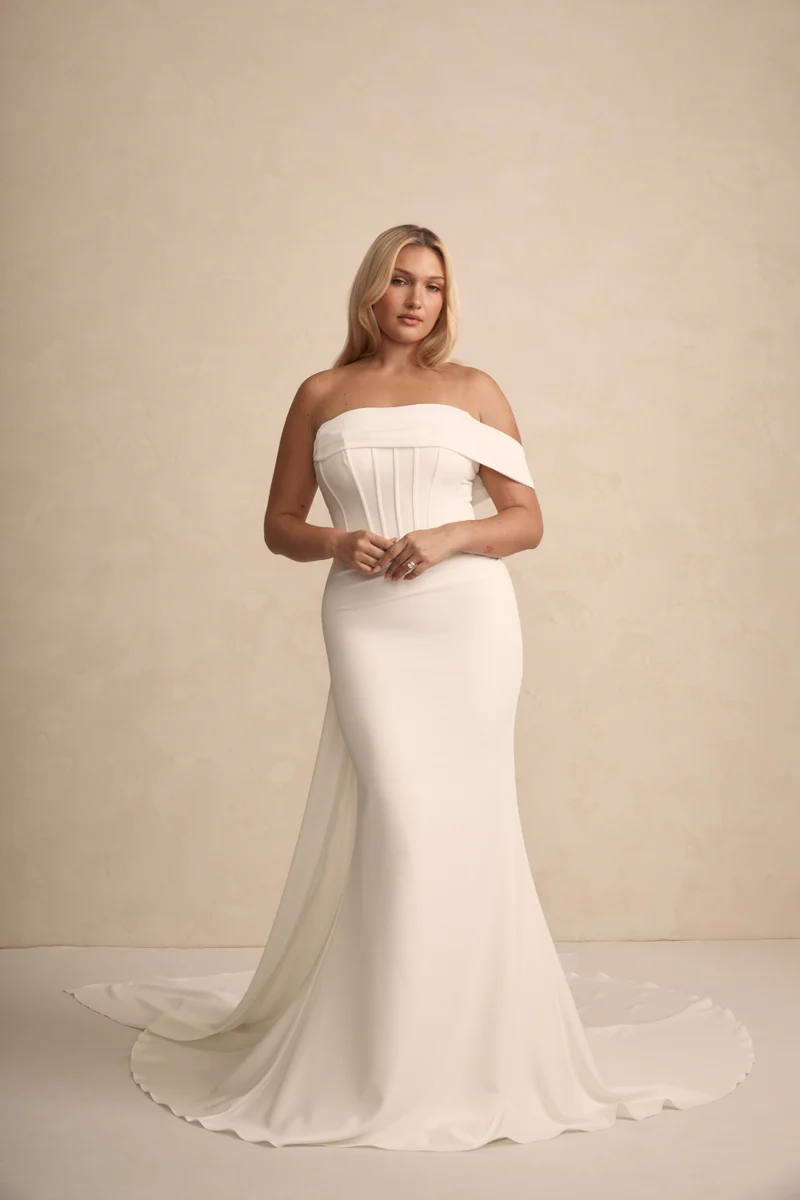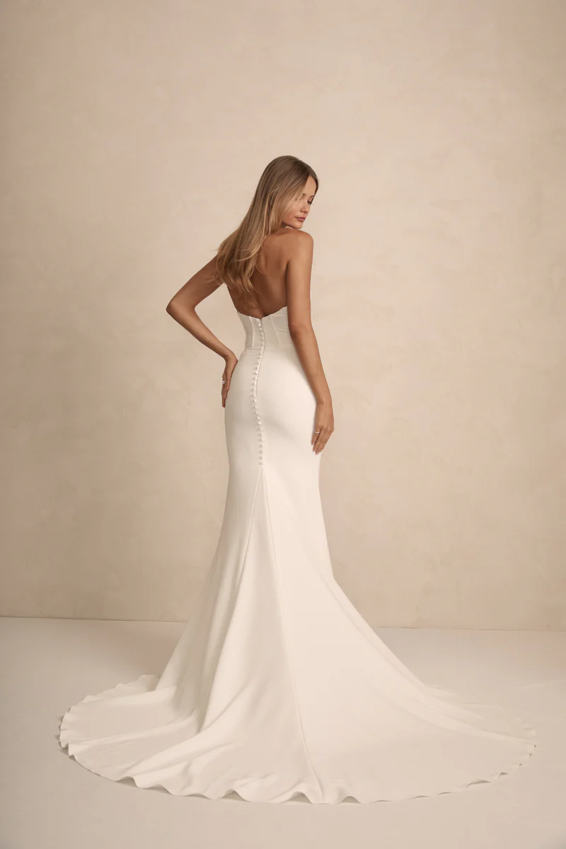 Rhode’s striking bodice features a peaked design at the bust with statement exposed boning, sculpting your silhouette with an alluring yet refined edge. Soft French crepe draping cascades gracefully from the waist to the hips, creating a flattering silhouette that moves beautifully with every step, keeping you comfortable and confident.