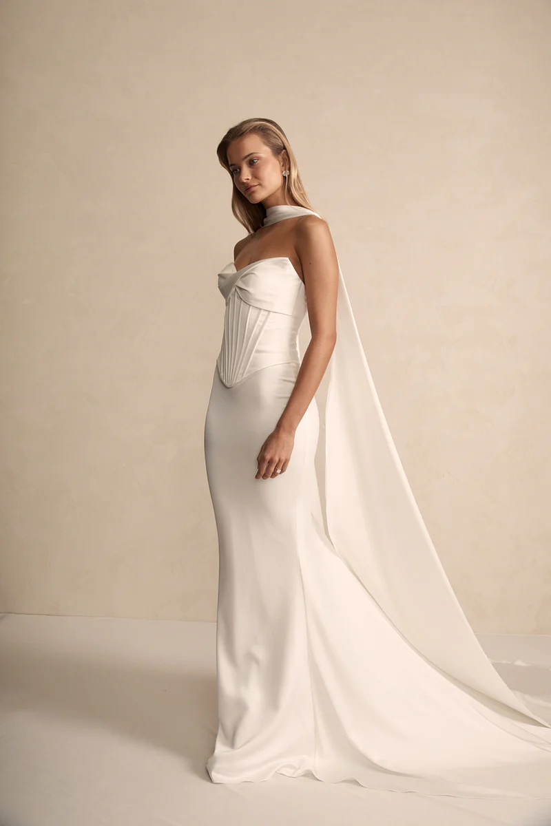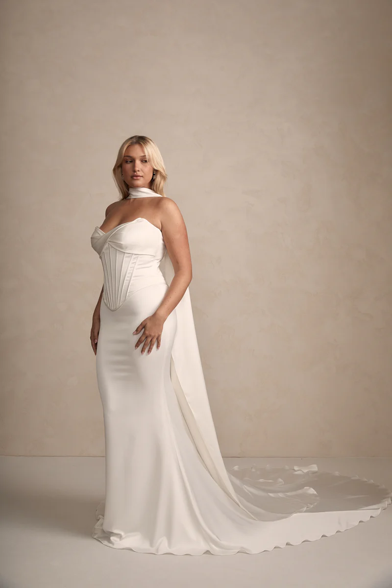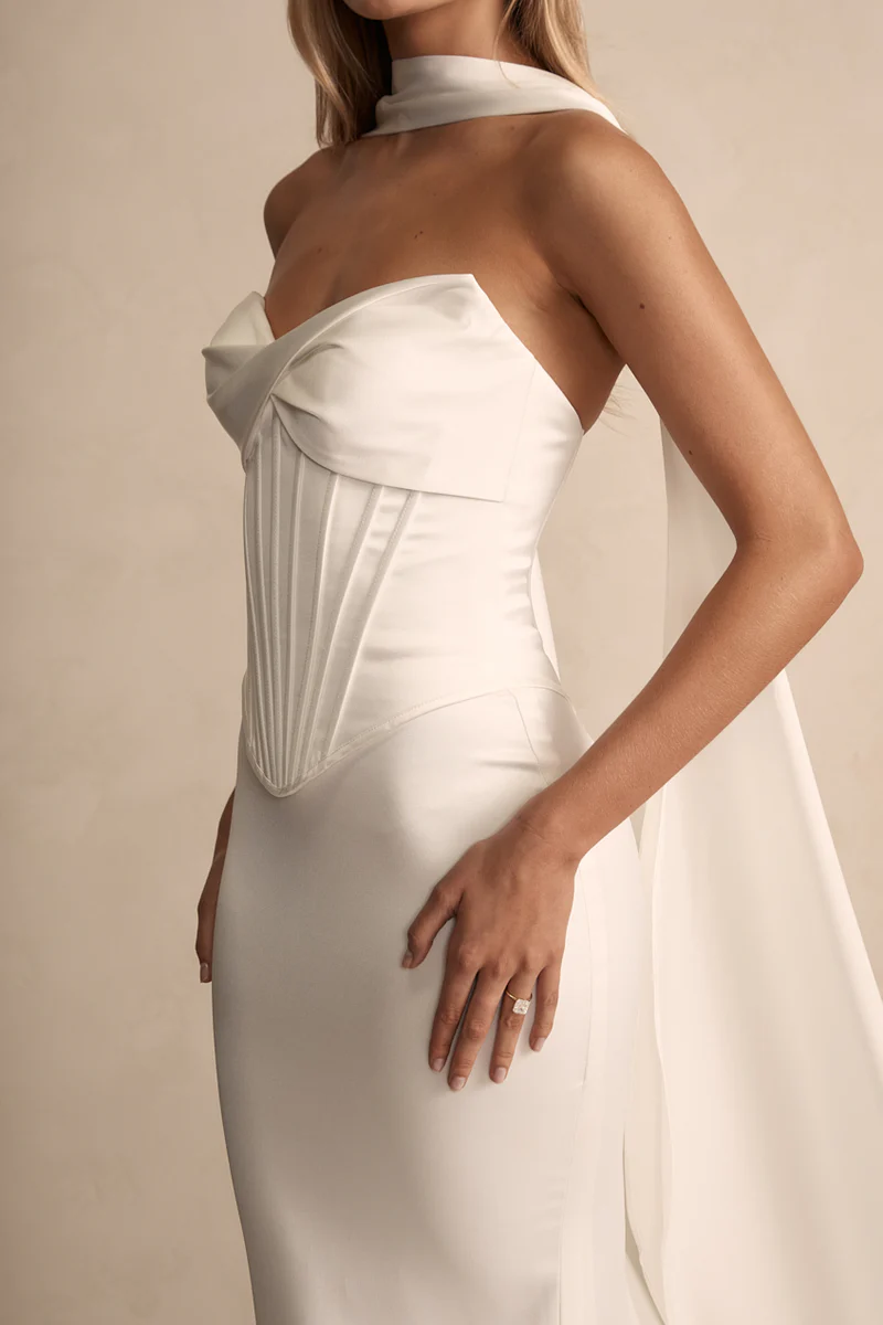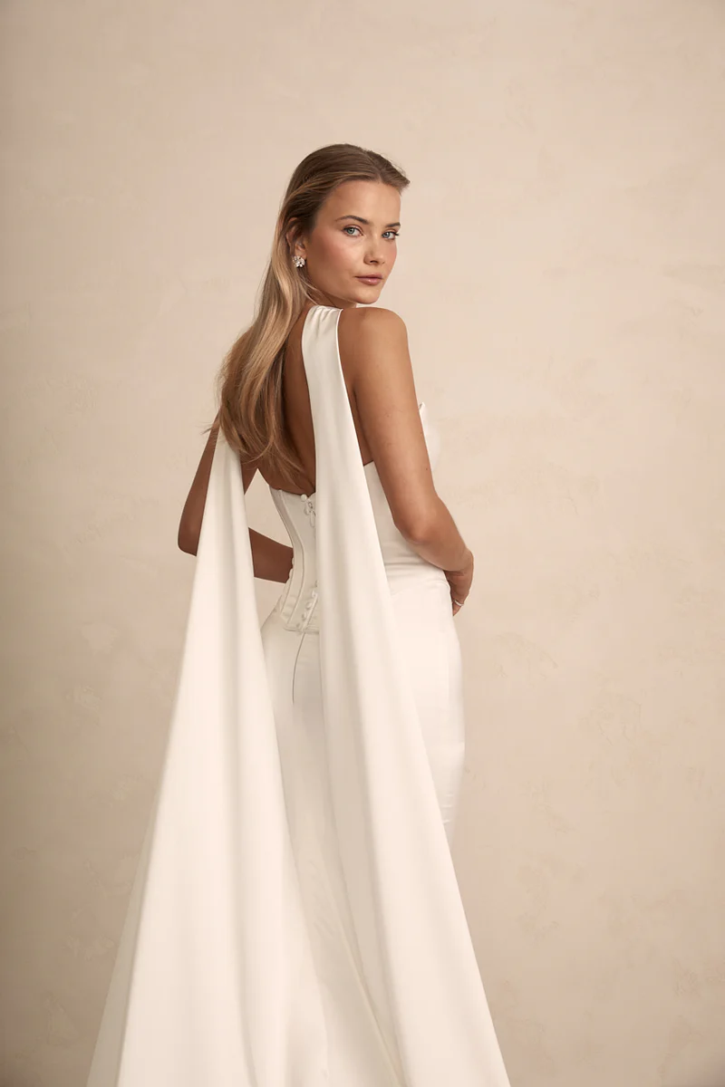Elevate your wedding day look with our elegant Satin Scarf. Crafted from our softest ivory satin, it complements all MWL designs and offers versatile styling for two stunning looks, tailored to your unique vision.