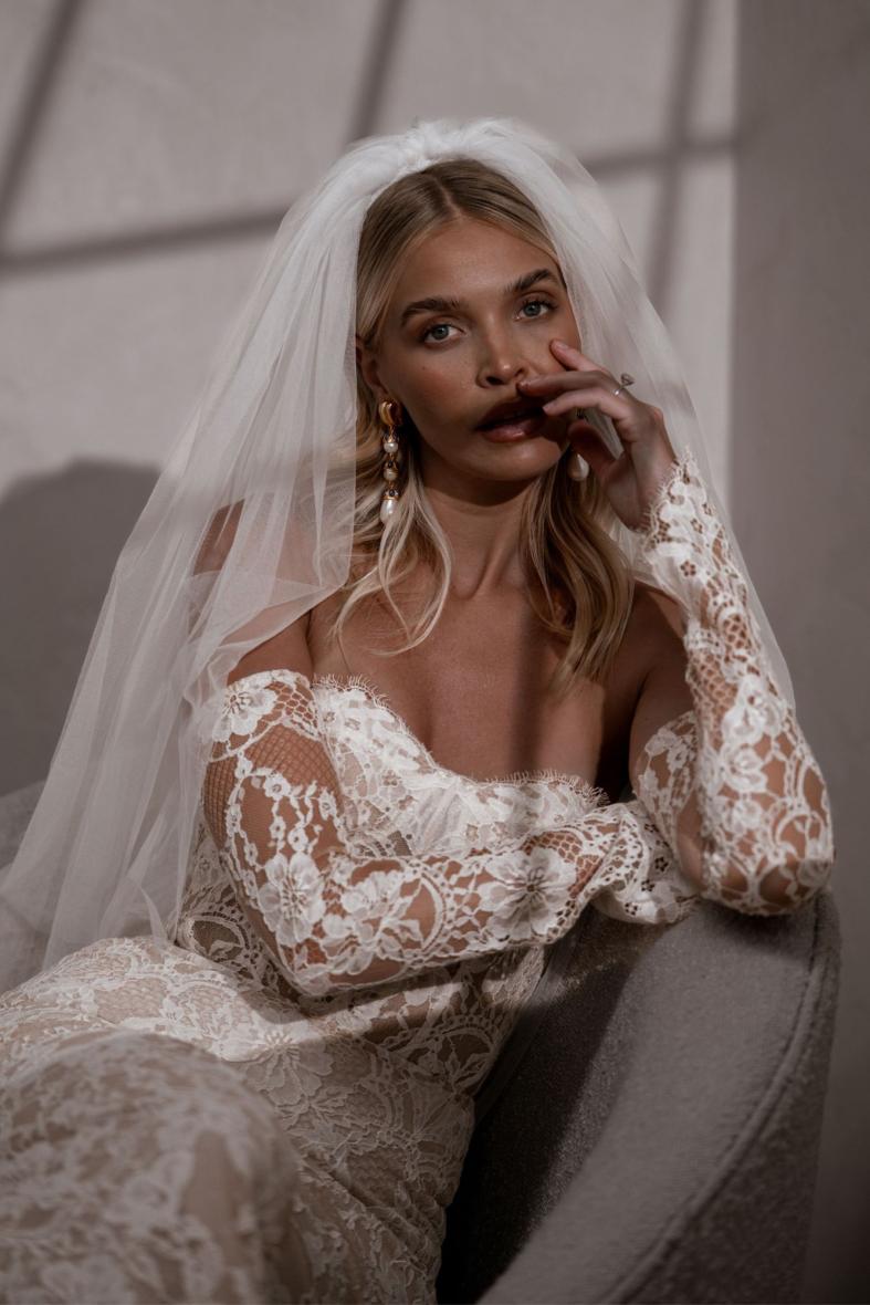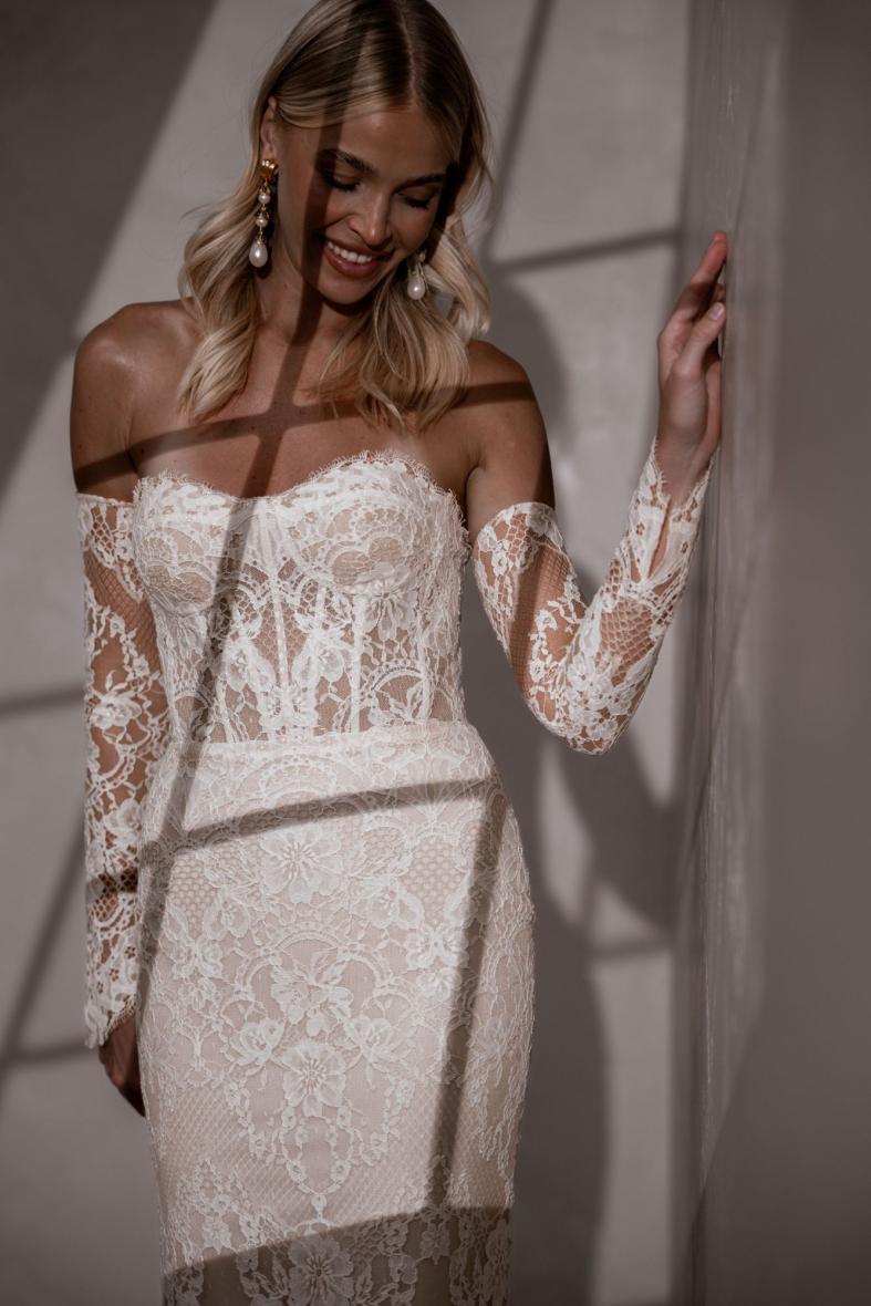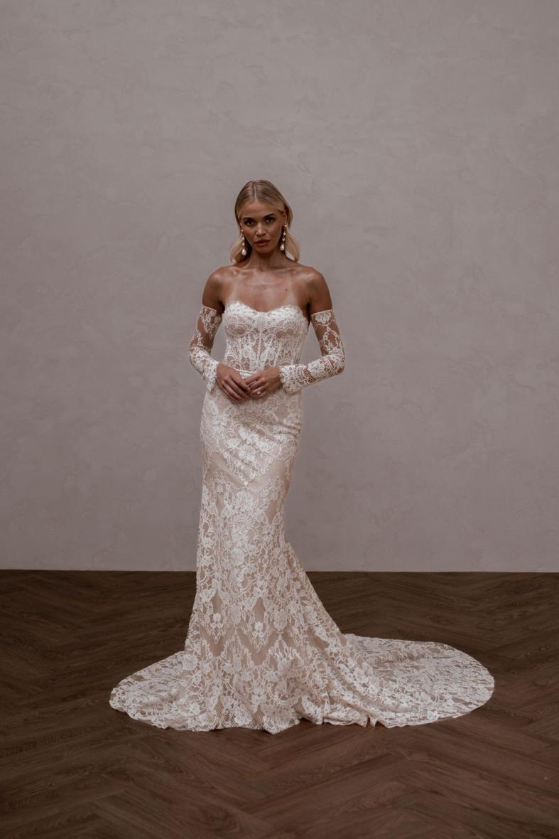 Winnie presents an impossible decision, as she is available in both our exclusive sand and traditional ivory colourways.  Her intricately beautiful Chantilly lace with stunning eyelash edges truly shines, regardless of the selected undertone.  Paired with her sheer removable sleeves and contouring bodice boning, she is a beauty that is sure to endure the test of time, giving a nod to tradition, yet fiercely embraces modern trends.