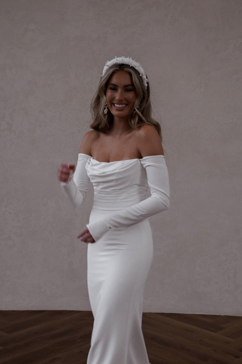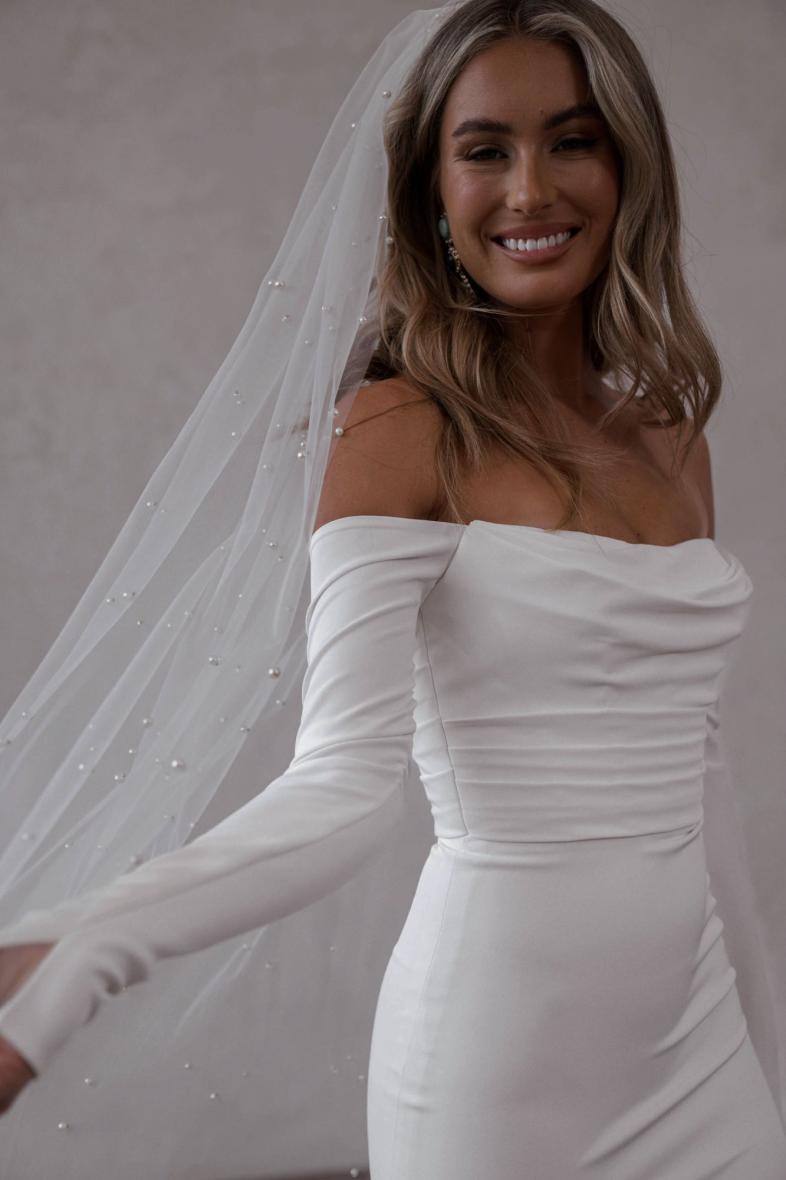 Winter features in demand, long, off-the-shoulder crepe sleeves, which have been intricately designed and perfected by our team over time to flatter every bride.