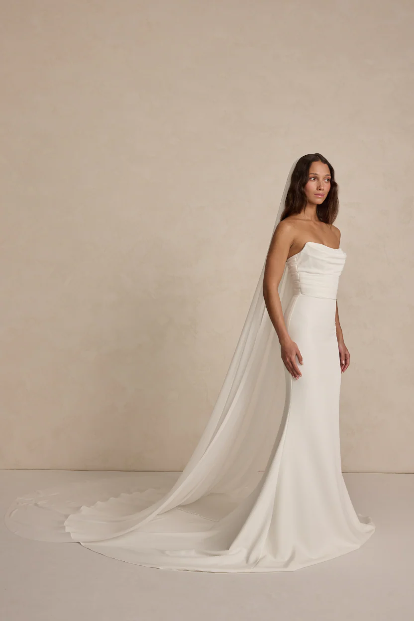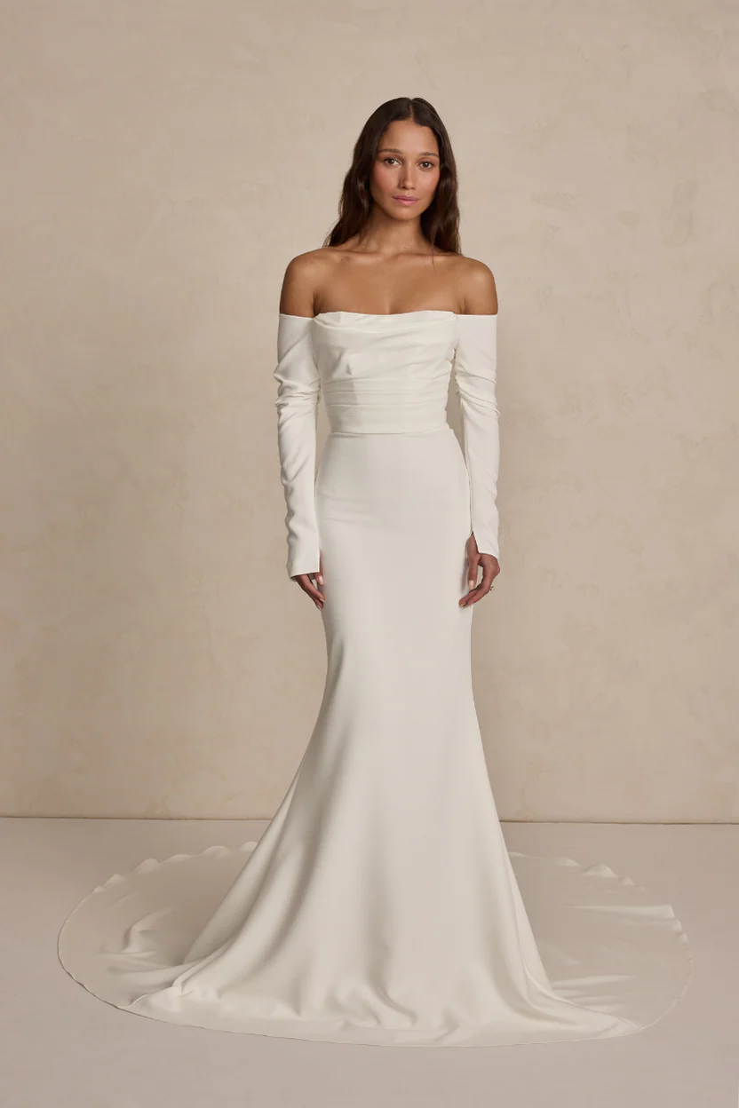 Winter features a fitted, sculpted bodice that flatters the figure, creating a timeless silhouette with modern elegance. Its clean lines and refined structure lend a graceful, effortlessly romantic look.
