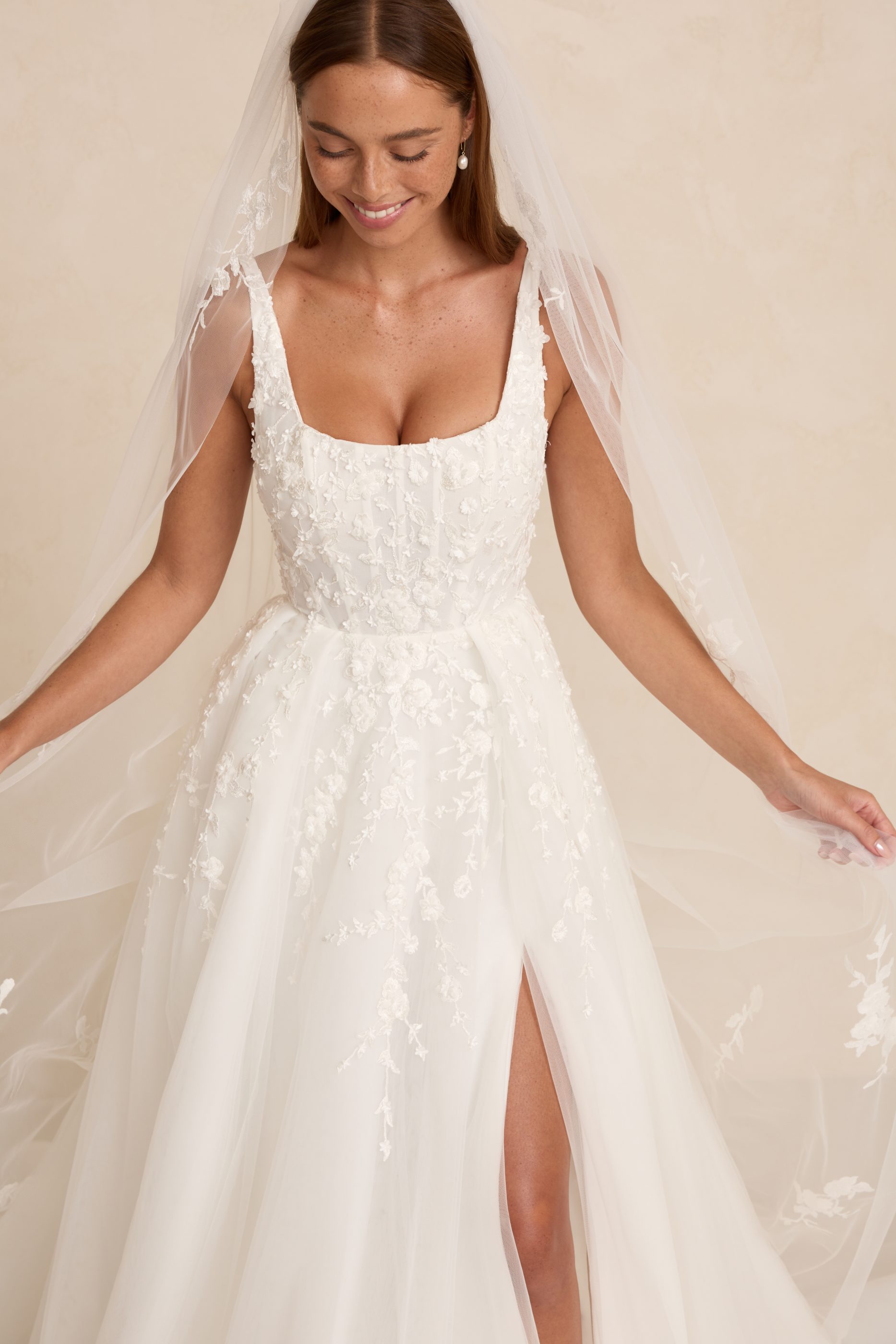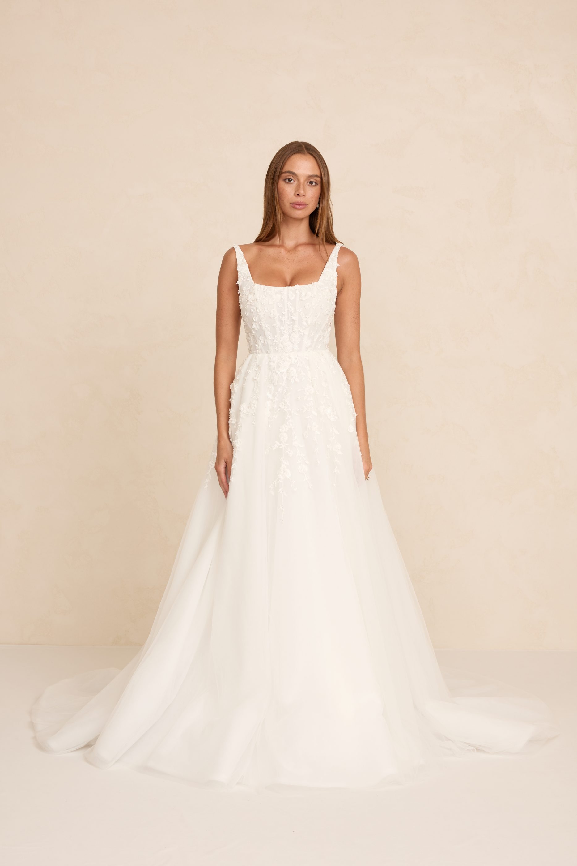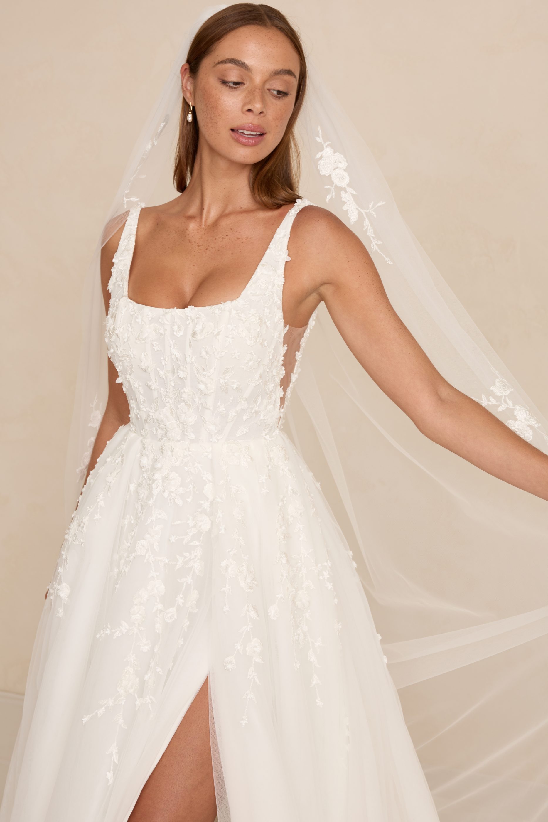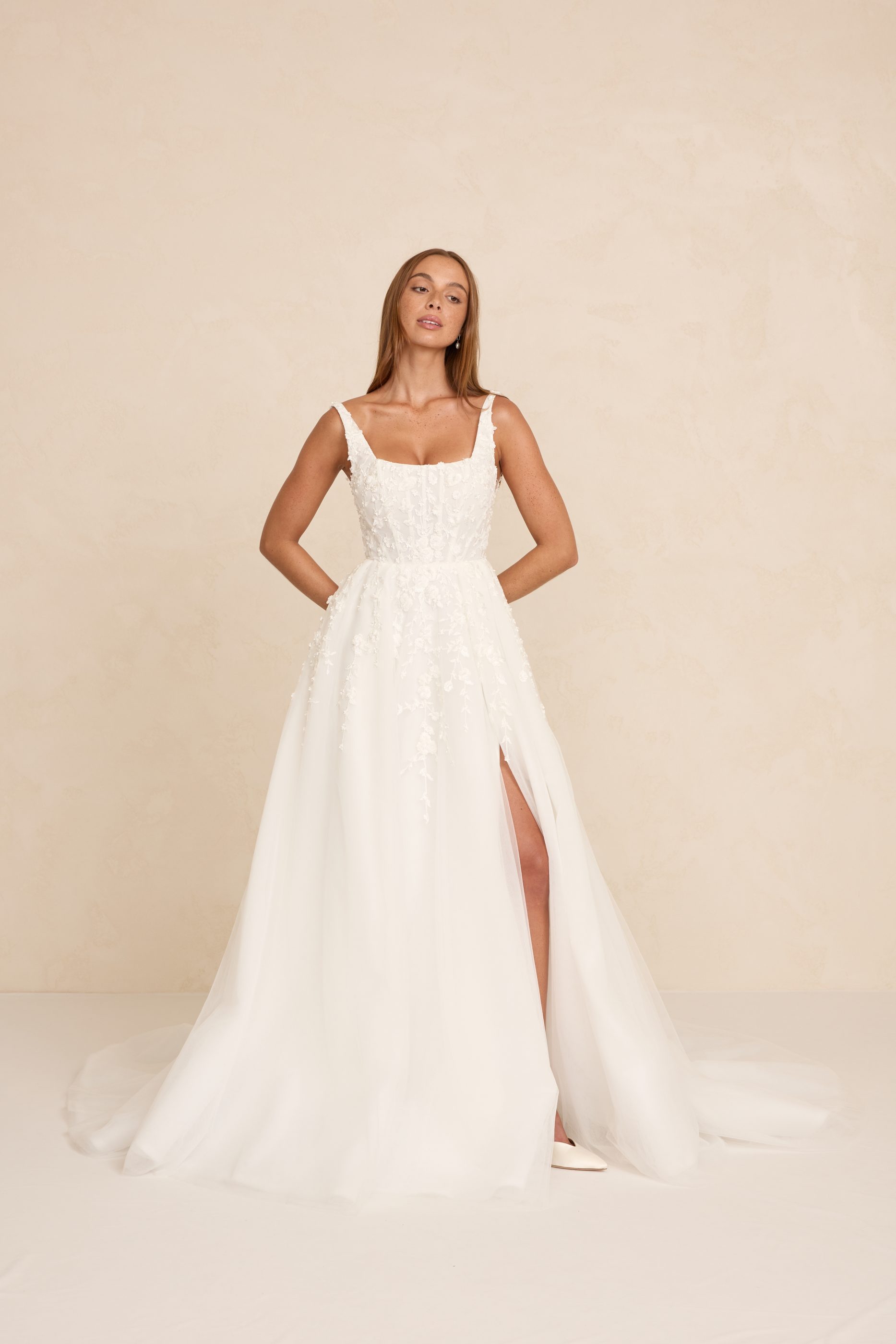 Zayn features a modern square neckline, illusion tulle side cut-outs, and a flowing skirt that moves with effortless grace. Crafted in dimensional 3D lace, it blends romantic texture with a light, airy silhouette. An optional skirt split adds a contemporary edge for brides who love a touch of drama.