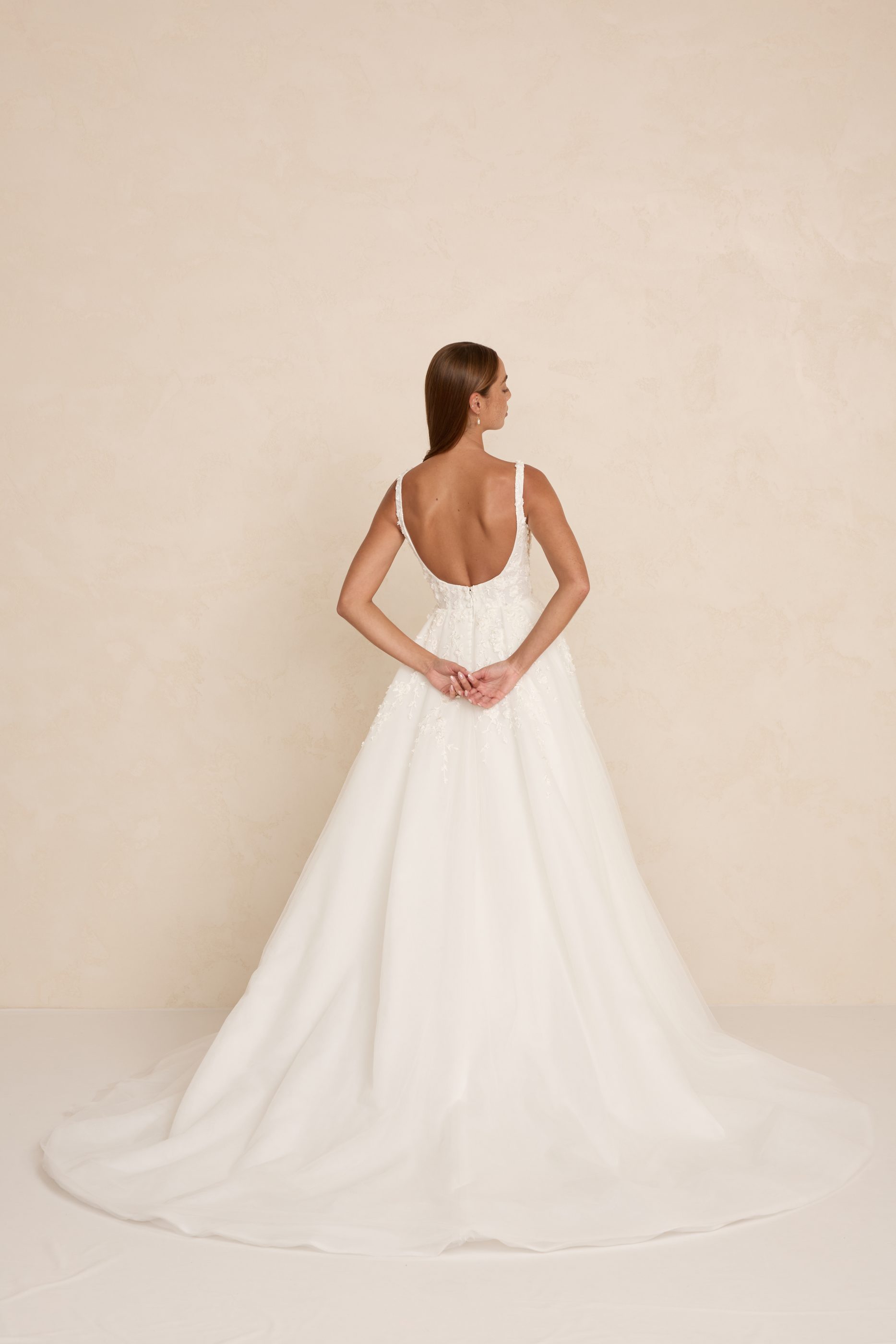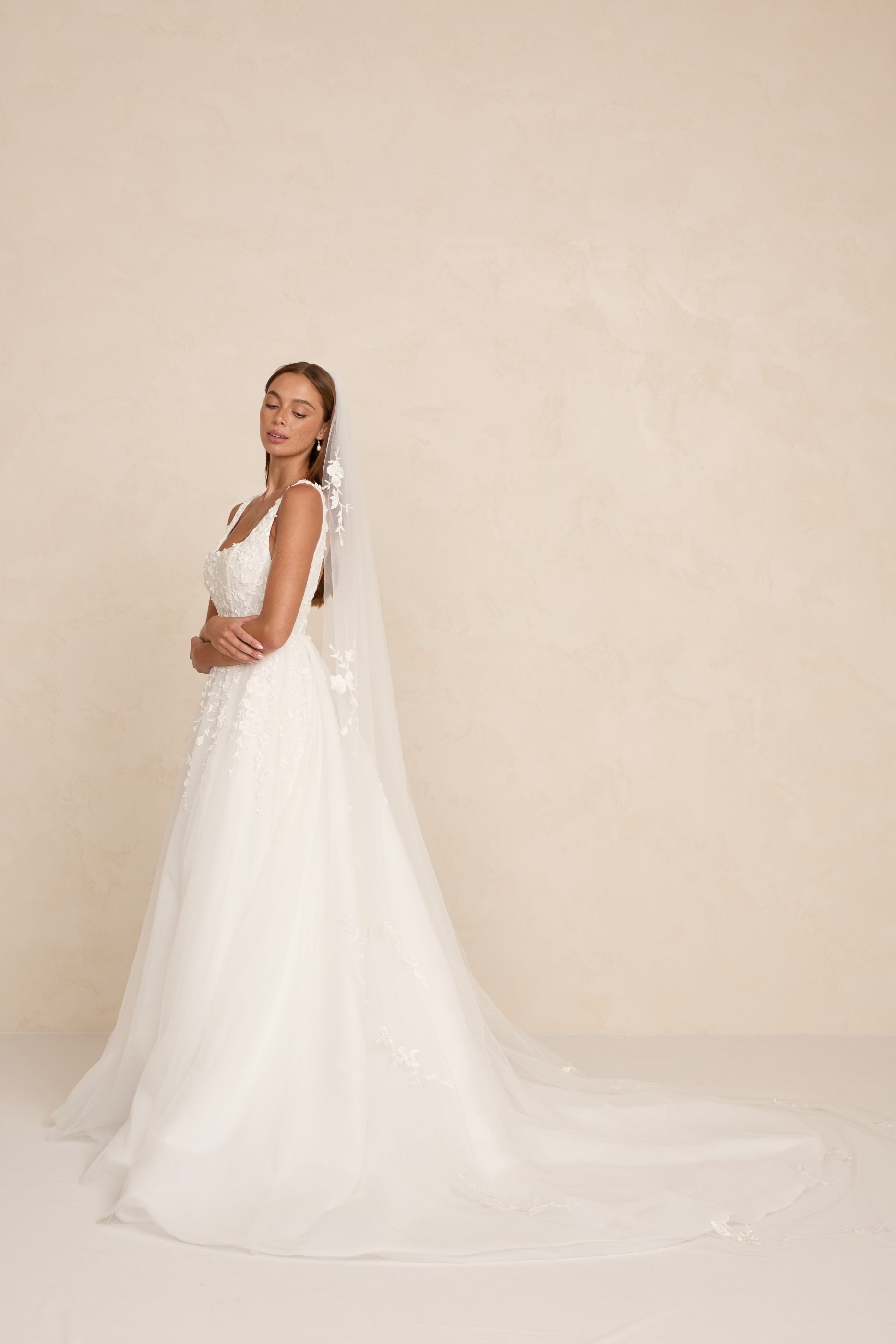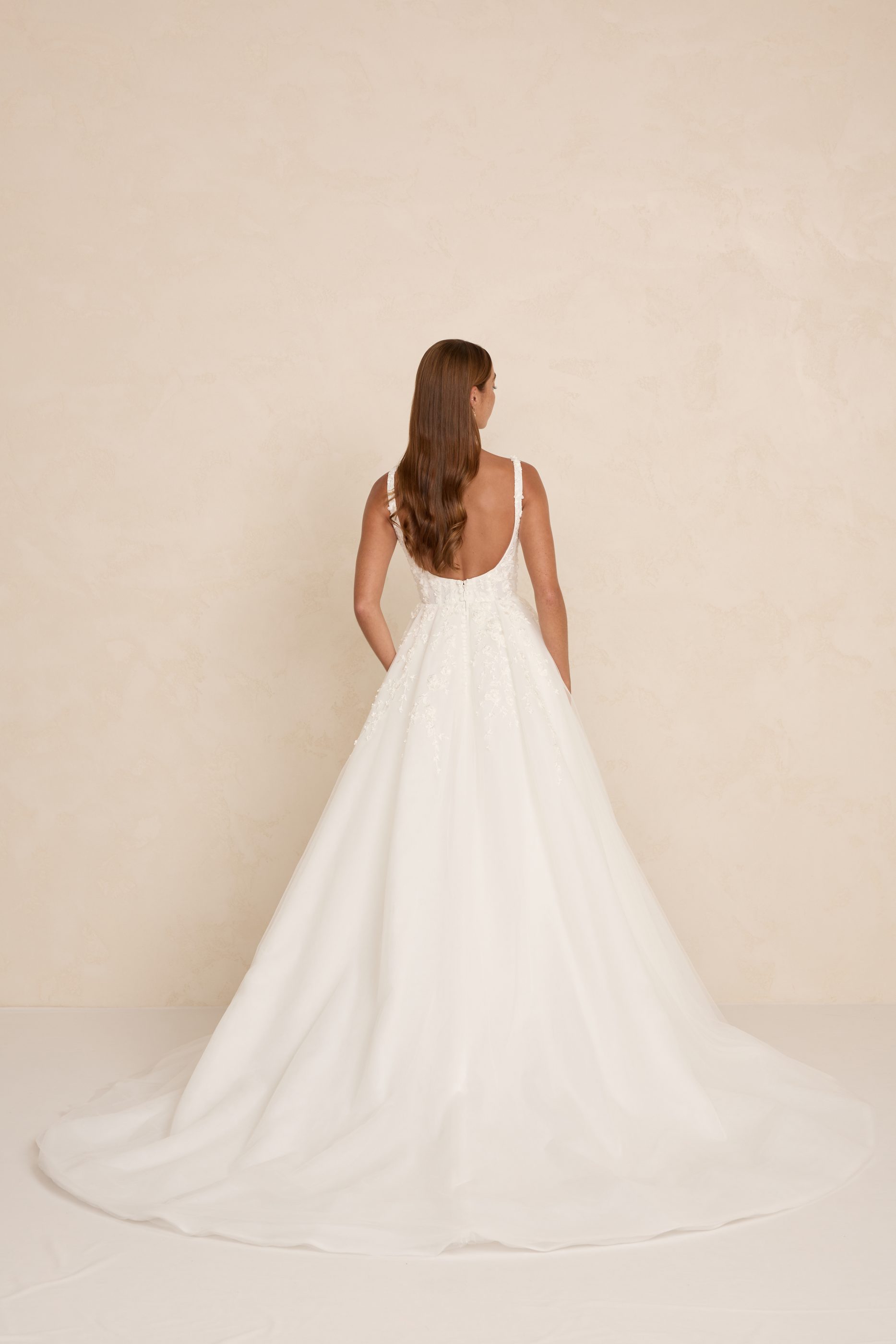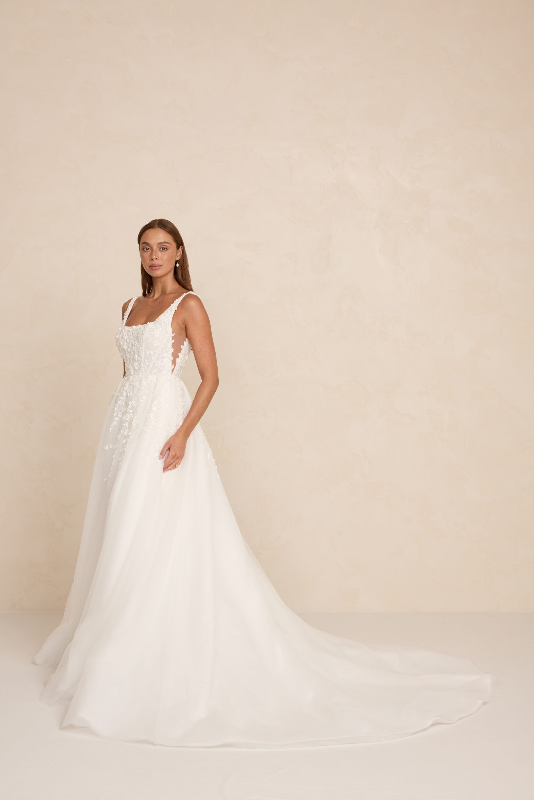 Zayn features a modern square neckline, illusion tulle side cut-outs, and a flowing skirt that moves with effortless grace. Crafted in dimensional 3D lace, it blends romantic texture with a light, airy silhouette. An optional skirt split adds a contemporary edge for brides who love a touch of drama.